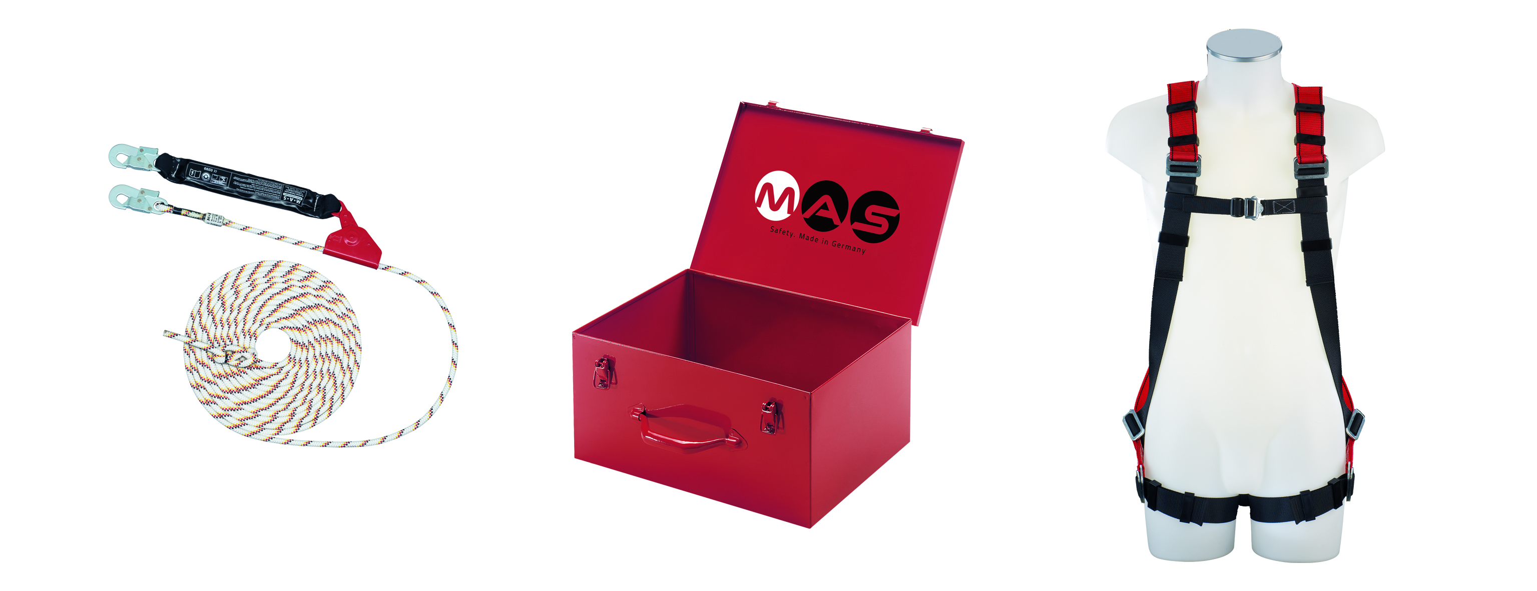 Sicherheitsset bestehend aus:1x Auffanggurt MAS 10 (1010010)1x Auffanggerät MAS SK12-15m (31815) Kernmantelseil1x Gerätekoffer (51215)
