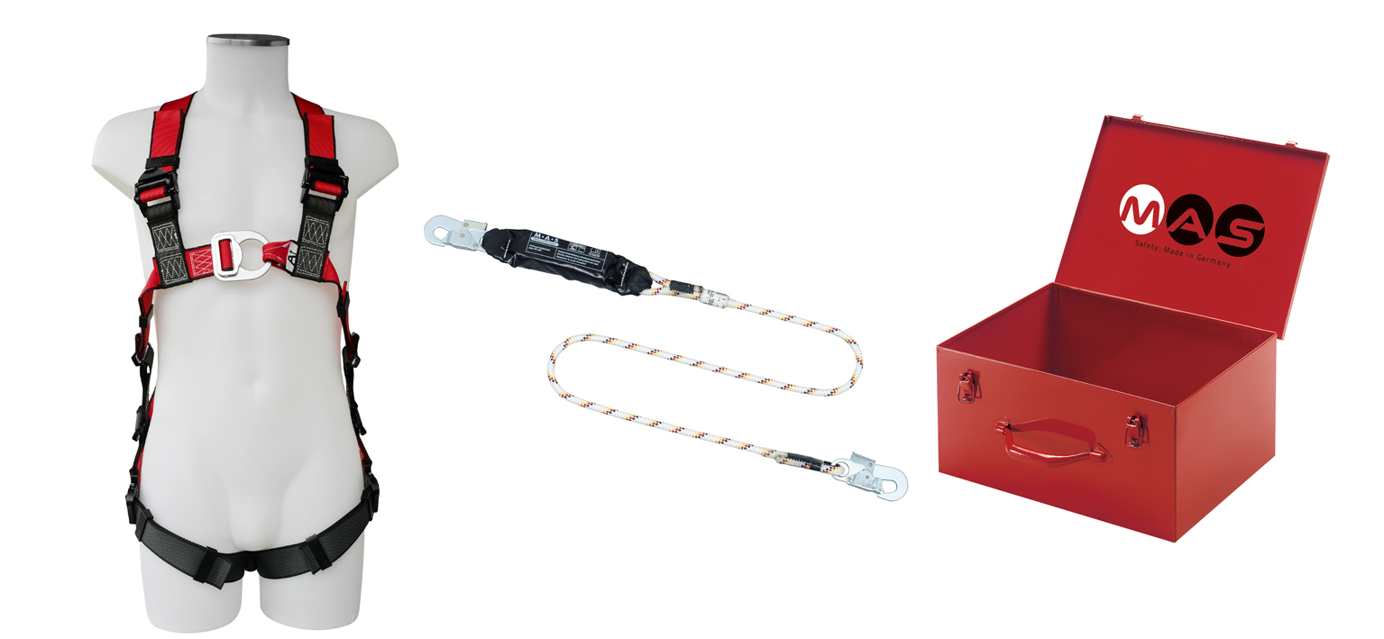 Sicherheitsset bestehend aus:1x Auffanggurt MAS 40, Quick (1041010)1x BFD-VB 2m (674002)1x Stahlblechkoffer (51215)