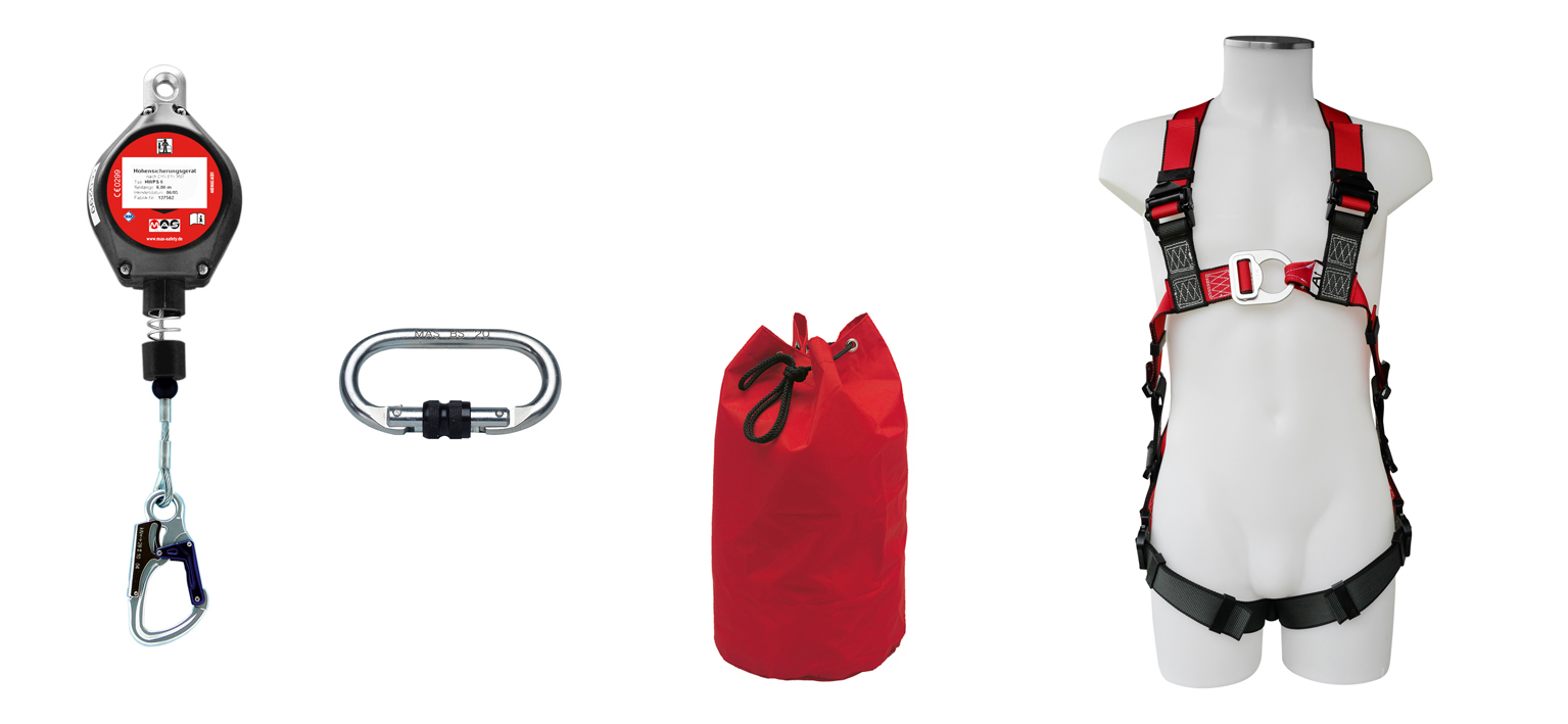 Sicherheitsset für Hubarbeitsbühnenbestehend aus:1x Auffanggurt MAS 40, Quick (1041010)1x Höhensicherungsgerät ACB 1,8m (51581-B)1x Karabinerhaken BS 20 (52501)1x Gerätebeutel (51214)