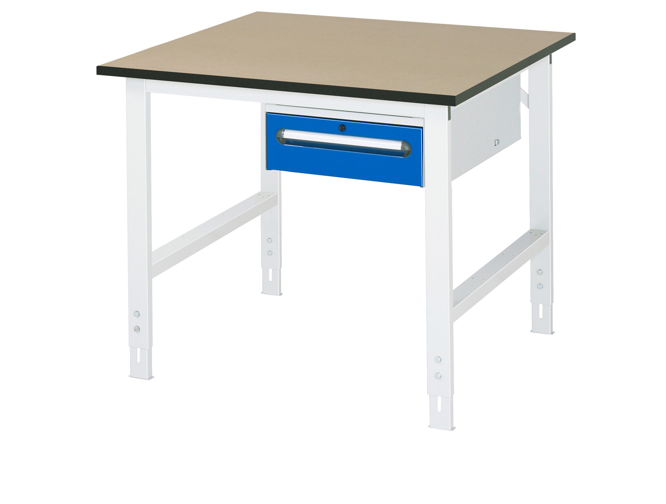 Arbeitstisch Serie Tom (K-Modell 02) B1000 x T1000 x H760-1080 mm MDF-Platte 22 mm. Gestell 60x30 mm, Arbeitshöhe verstellbar. Unterbau-Container mit 1 x Schublade 150 mm. Pulverbeschichtung Flächenlast max. 500 kg Lieferung zerlegt - einfachste Montage Qualitätsgarantie 5 Jahre Made in Germany