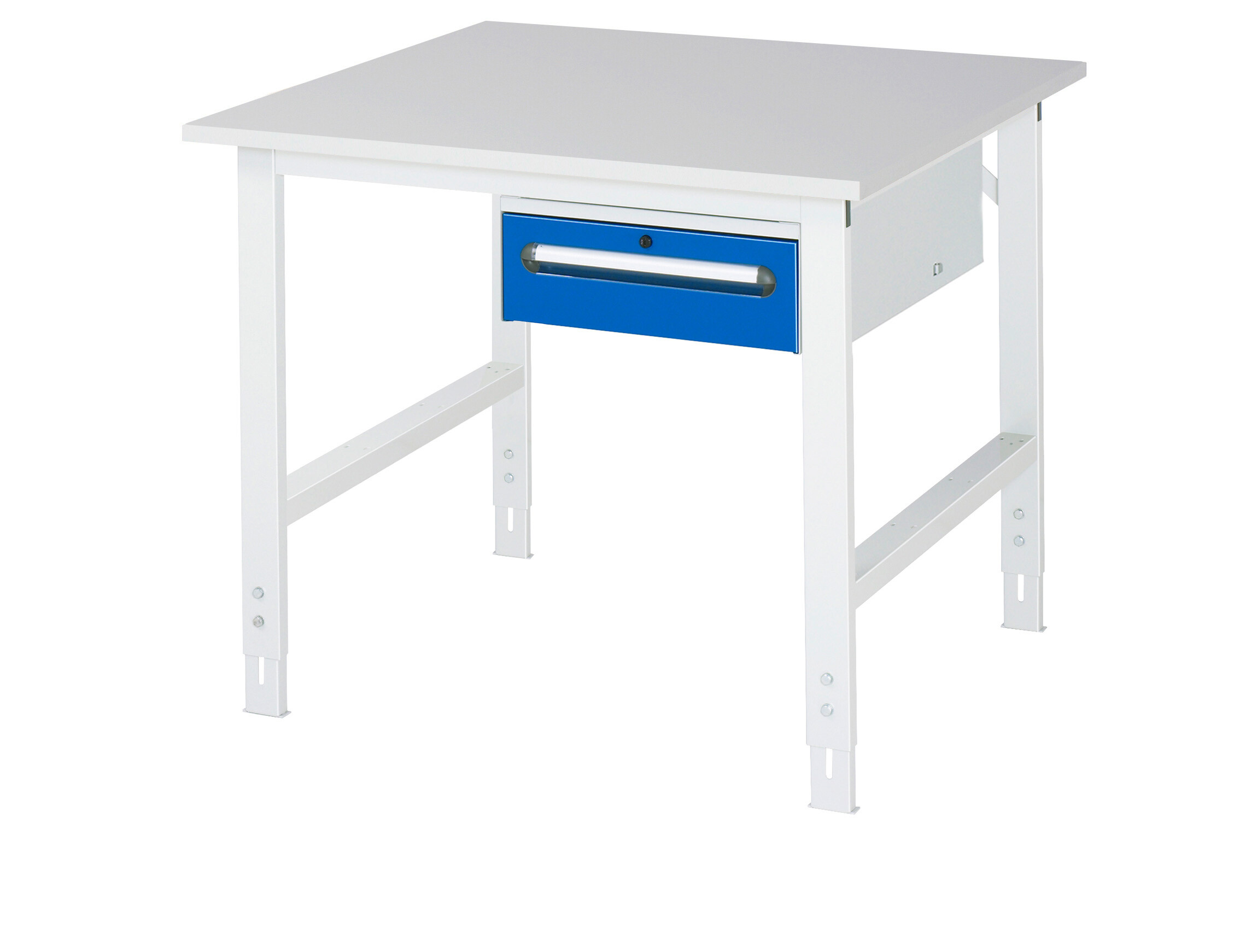 Arbeitstisch Serie Tom (K-Modell 02) B1000 x T1000 x H760-1080 mm Melamin-Platte 22 mm. Gestell 60x30 mm, Arbeitshöhe verstellbar. Unterbau-Container mit 1 x Schublade 150 mm. Pulverbeschichtung Flächenlast max. 500 kg Lieferung zerlegt - einfachste Montage Qualitätsgarantie 5 Jahre Made in Germany