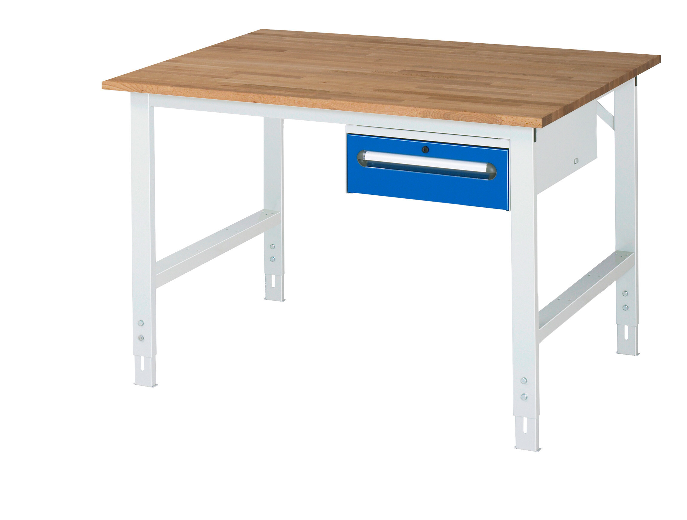 Arbeitstisch Serie Tom (K-Modell 02) B1250 x T1000 x H760-1080 mm Buche-Massiv-Platte 25 mm. Gestell 60x30 mm, Arbeitshöhe verstellbar. Unterbau-Container mit 1 x Schublade 150 mm. Pulverbeschichtung Flächenlast max. 500 kg Lieferung zerlegt - einfachste Montage Qualitätsgarantie 5 Jahre Made in Germany