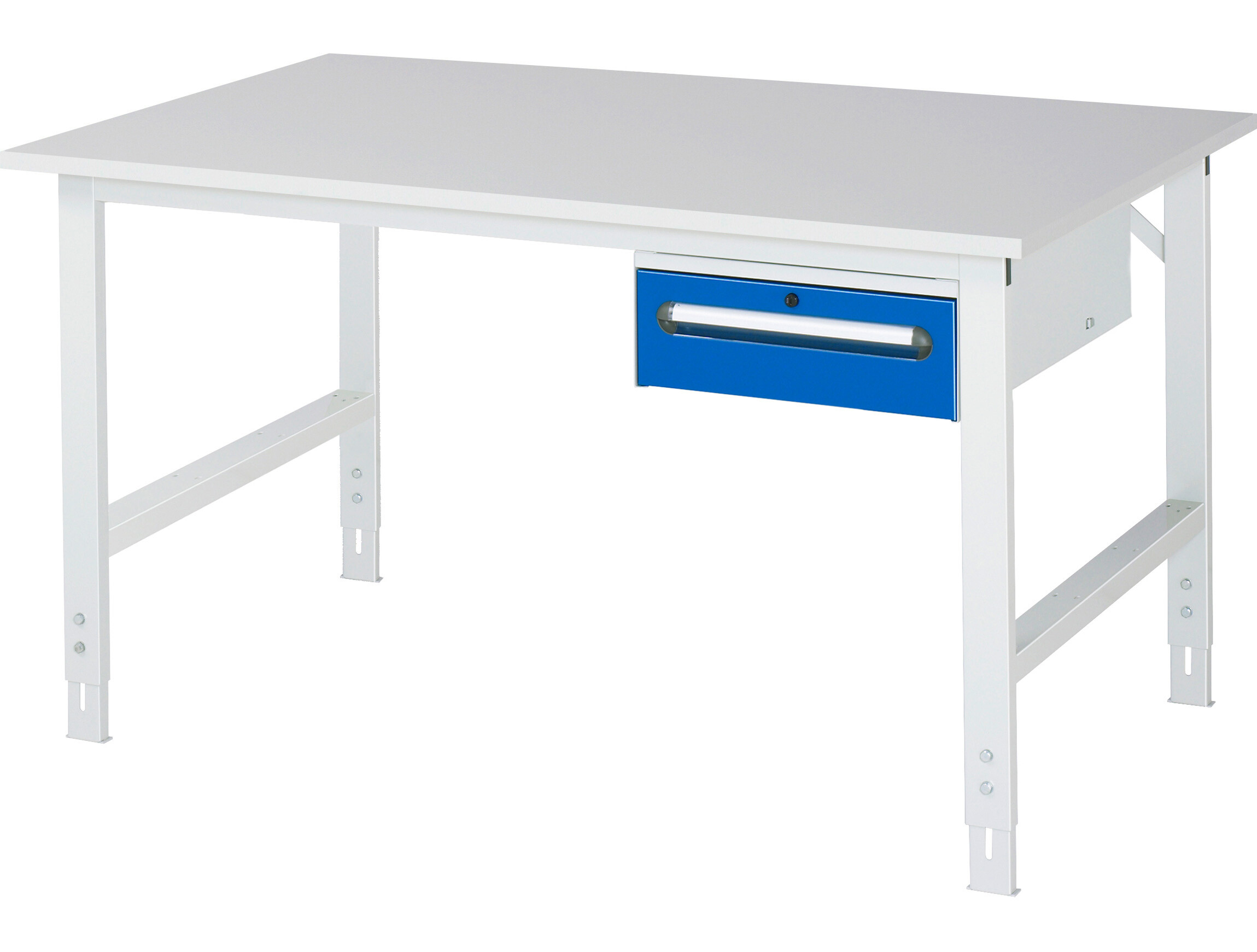 Arbeitstisch Serie Tom (K-Modell 02) B1500 x T1000 x H760-1080 mm Melamin-Platte 22 mm. Gestell 60x30 mm, Arbeitshöhe verstellbar. Unterbau-Container mit 1 x Schublade 150 mm. Pulverbeschichtung Flächenlast max. 500 kg Lieferung zerlegt - einfachste Montage Qualitätsgarantie 5 Jahre Made in Germany