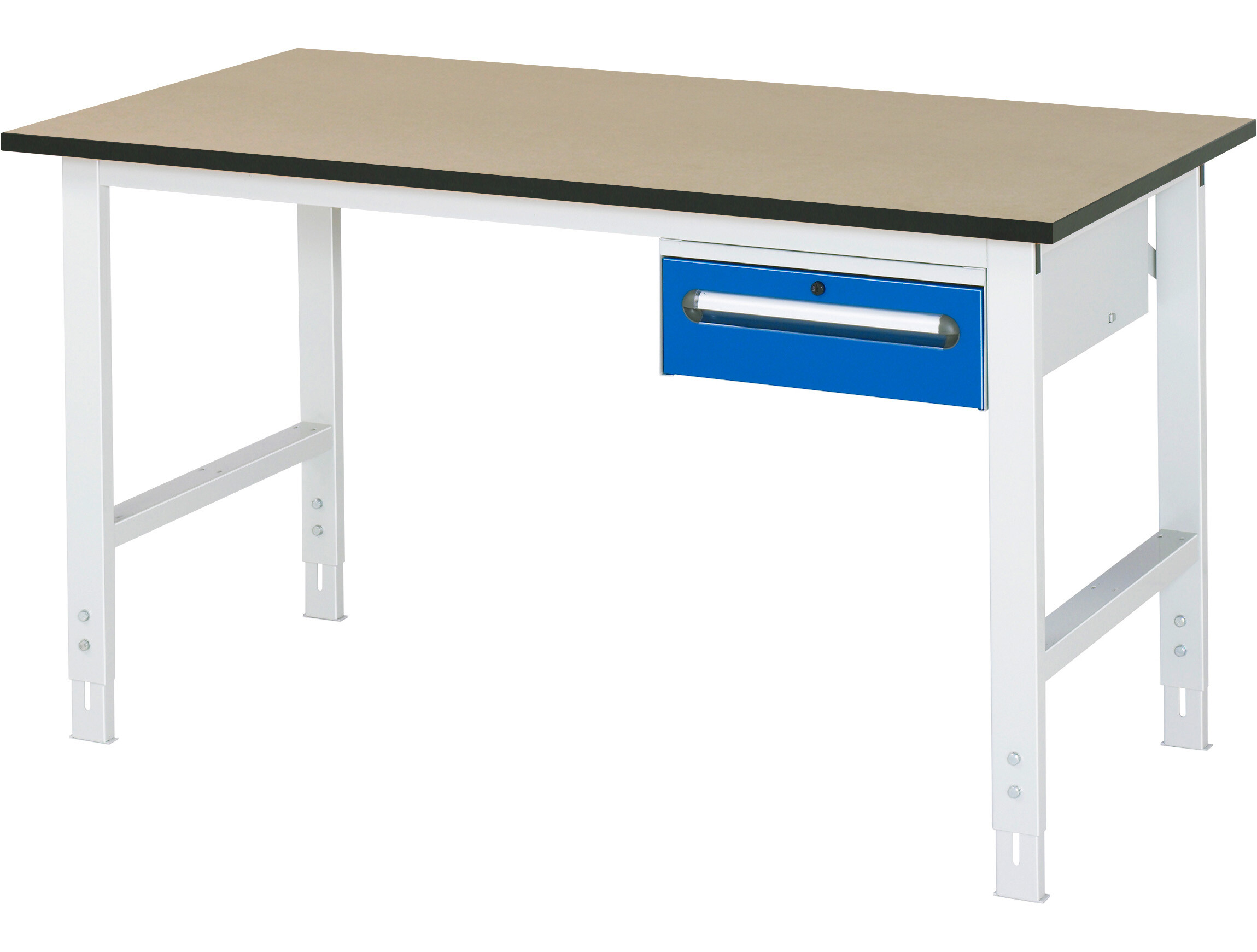 Arbeitstisch Serie Tom (K-Modell 02) B1500 x T800 x H760-1080 mm MDF-Platte 22 mm. Gestell 60x30 mm, Arbeitshöhe verstellbar. 1 x Schublade auf rollengelagerten Auszugsschienen (1xH150 mm). Pulverbeschichtung Flächenlast max. 500 kg Lieferung zerlegt - einfachste Montage Qualitätsgarantie 5 Jahre Made in Germany