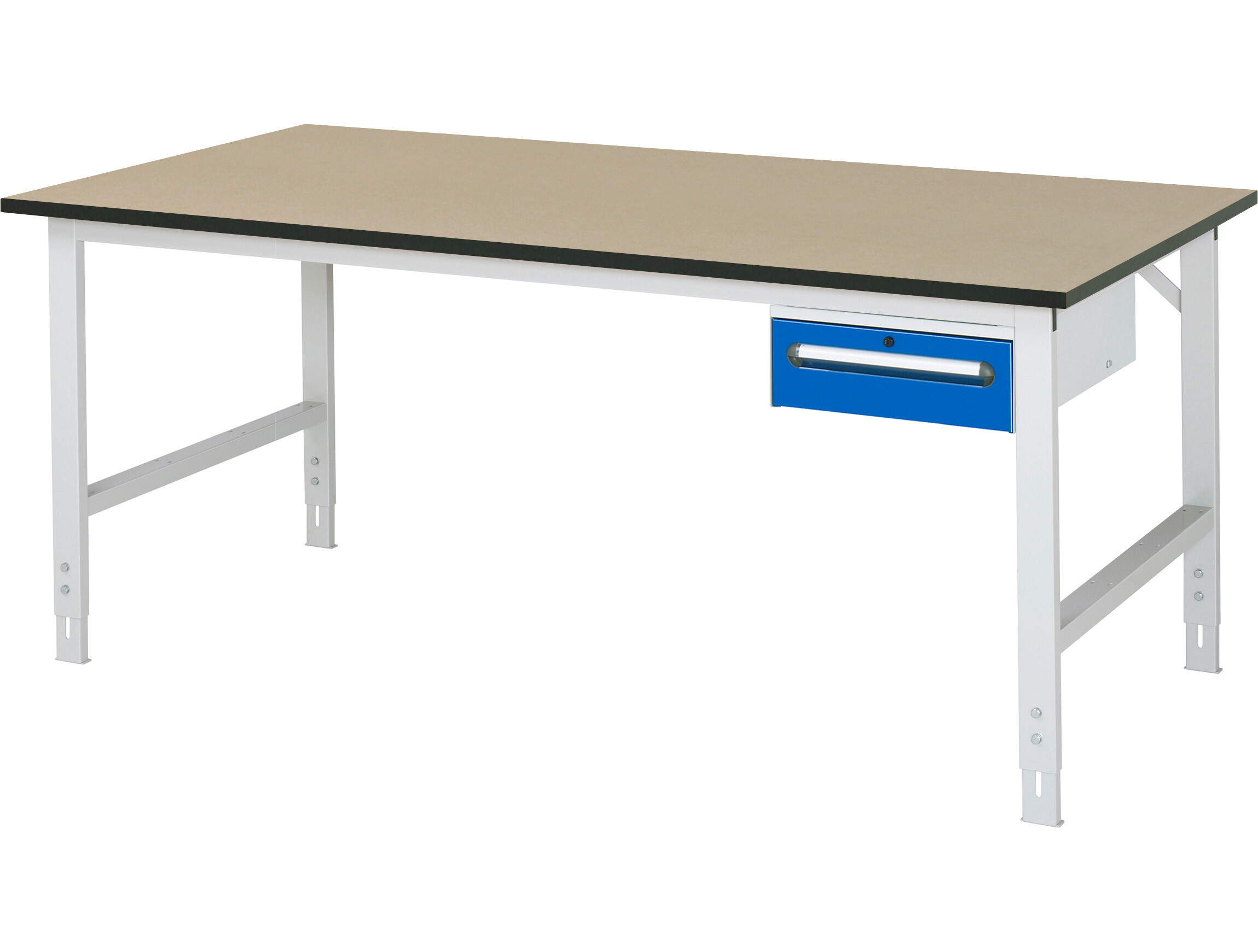 Arbeitstisch Serie Tom (K-Modell 02) B2000 x T1000 x H760-1080 mm MDF-Platte 22 mm. Gestell 60x30 mm, Arbeitshöhe verstellbar. 1 x Schublade auf rollengelagerten Auszugsschienen (1xH150 mm). Pulverbeschichtung Flächenlast max. 500 kg Lieferung zerlegt - einfachste Montage Qualitätsgarantie 5 Jahre Made in Germany
