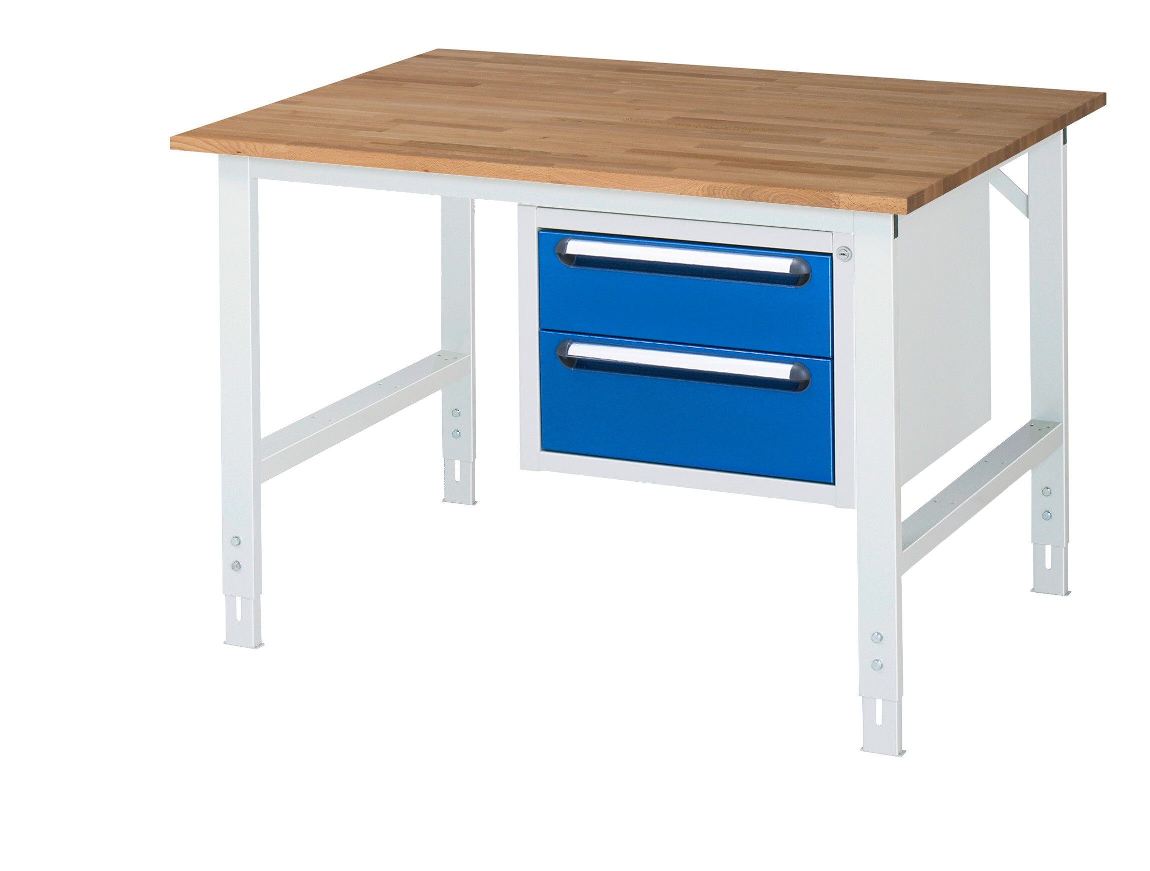 Arbeitstisch Serie Tom (K-Modell 03) B1250 x T1000 x H760-1080 mm Buche-Massiv-Platte 25 mm. Gestell 60x30 mm, Arbeitshöhe verstellbar. Unterbau-Container mit 2 x Schublade 1x150, 1x180 mm. Pulverbeschichtung Flächenlast max. 500 kg Lieferung zerlegt - einfachste Montage Qualitätsgarantie 5 Jahre Made in Germany