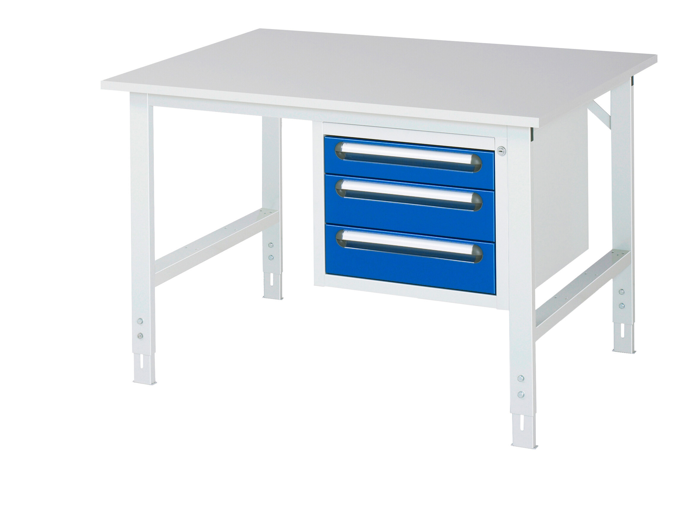 Arbeitstisch Serie Tom (K-Modell 04) B1250 x T1000 x H760-1080 mm Melamin-Platte 22 mm. Gestell 60x30 mm, Arbeitshöhe verstellbar. Unterbau-Container mit 3 x Schublade 1x90, 2x120 mm. Pulverbeschichtung Flächenlast max. 500 kg Lieferung zerlegt - einfachste Montage Qualitätsgarantie 5 Jahre Made in Germany