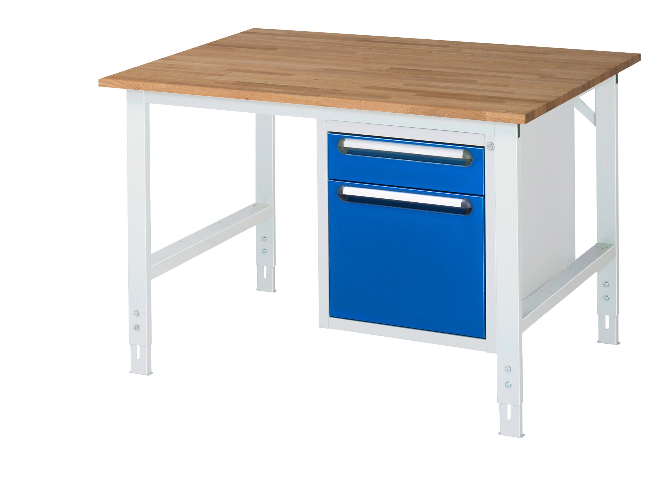 Arbeitstisch Serie Tom (K-Modell 05) B1250 x T1000 x H760-1080 mm Buche-Massiv-Platte 25 mm. Gestell 60x30 mm, Arbeitshöhe verstellbar. Unterbau-Container mit 2 x Schublade 1x120, 1x360 mm. Pulverbeschichtung Flächenlast max. 500 kg Lieferung zerlegt - einfachste Montage Qualitätsgarantie 5 Jahre Made in Germany