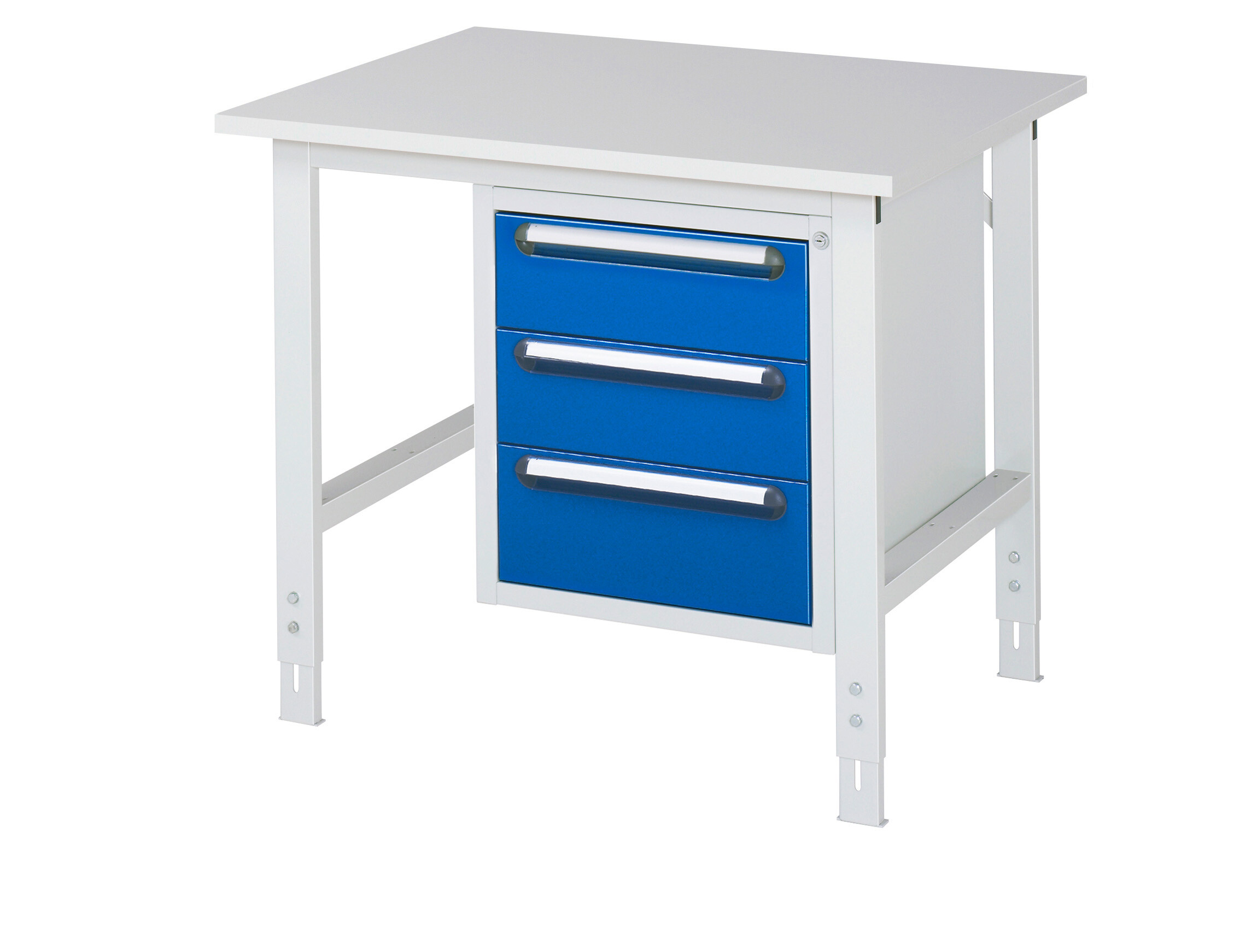 Arbeitstisch Serie Tom (K-Modell 06) B1000 x T800 x H760-1080 mm Melaminharzbeschichtete-Platte 22 mm. Gestell 60x30 mm, Arbeitshöhe verstellbar. 3 x Schublade auf rollengelagerten Auszugsschienen (2xH150, 1xH180 mm). Pulverbeschichtung Flächenlast max. 500 kg Lieferung zerlegt - einfachste Montage Qualitätsgarantie 5 Jahre Made in Germany