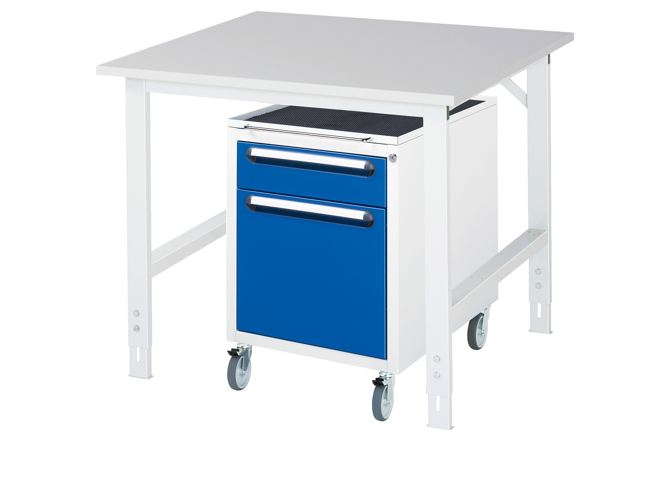 Arbeitstisch Serie Tom (K-Modell 08) B1000 x T1000 x H760-1080 mm Melamin-Platte 22 mm. Gestell 60x30 mm, Arbeitshöhe verstellbar. Roll-Container mit 2 x Schublade 1x120, 1x360 mm Pulverbeschichtung Flächenlast max. 500 kg Lieferung zerlegt - einfachste Montage Qualitätsgarantie 5 Jahre Made in Germany