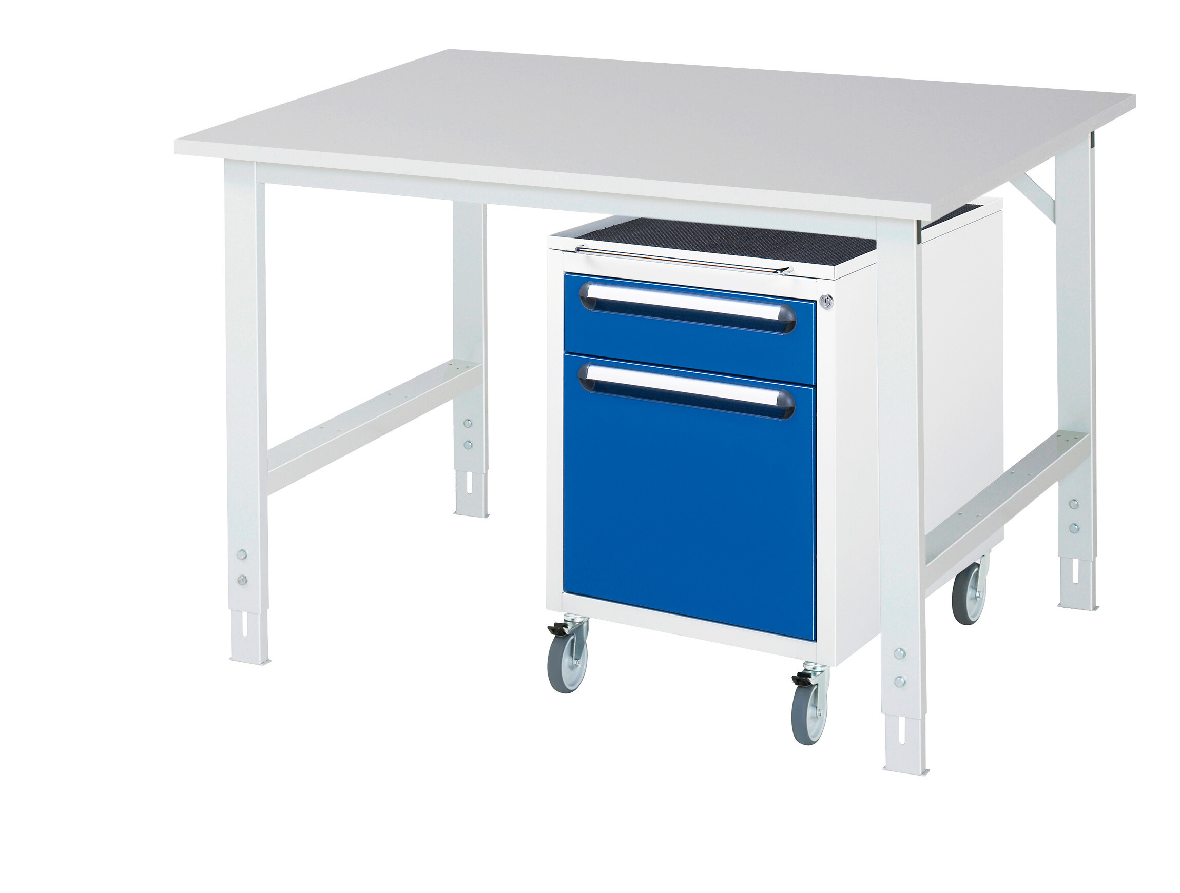 Arbeitstisch Serie Tom (K-Modell 08) B1250 x T1000 x H760-1080 mm Melamin-Platte 22 mm. Gestell 60x30 mm, Arbeitshöhe verstellbar. Roll-Container mit 2 x Schublade 1x120, 1x360 mm Pulverbeschichtung Flächenlast max. 500 kg Lieferung zerlegt - einfachste Montage Qualitätsgarantie 5 Jahre Made in Germany