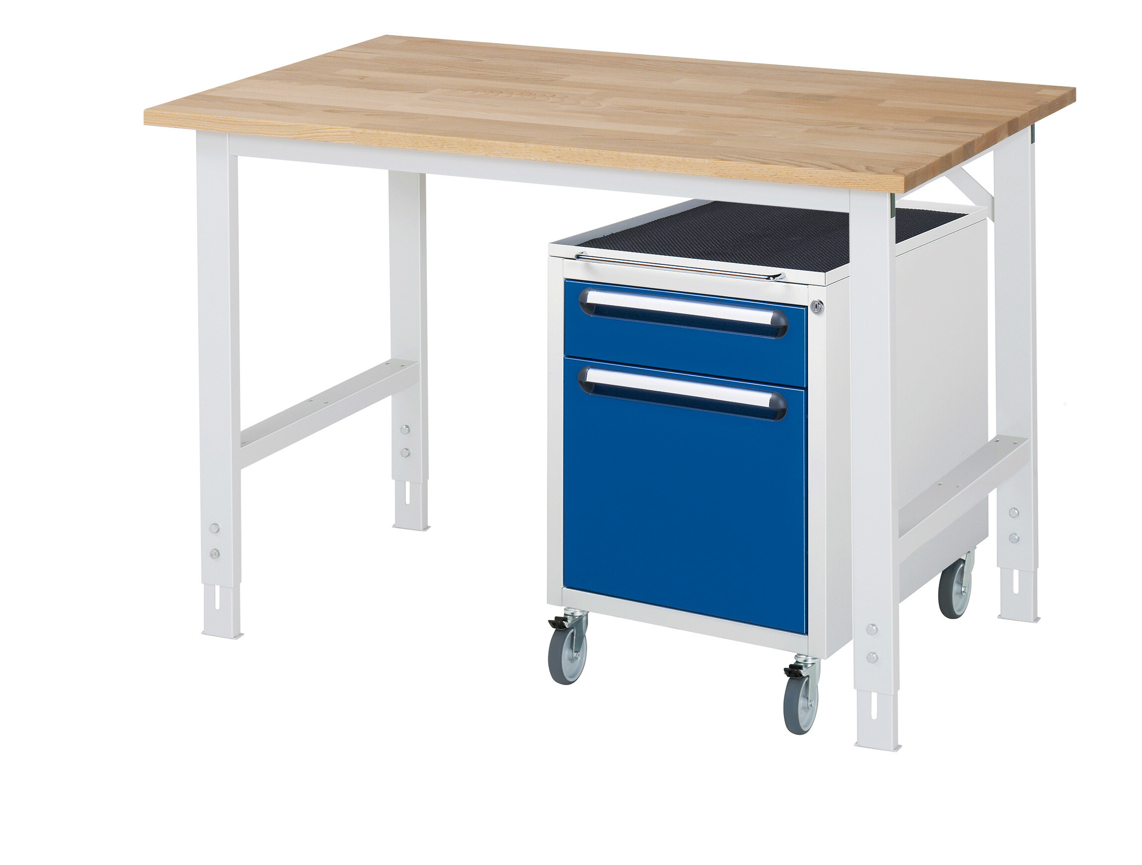 Arbeitstisch Serie Tom (K-Modell 08) B1250 x T800 x H760-1080 mm Buche-Massiv-Platte 25 mm. Gestell 60x30 mm, Arbeitshöhe verstellbar. Roll-Container mit 3 x Schublade auf rollengelagerten Auszugsschienen (1xH120, 1xH360 mm). Pulverbeschichtung Flächenlast max. 500 kg Lieferung zerlegt - einfachste Montage Qualitätsgarantie 5 Jahre Made in Germany