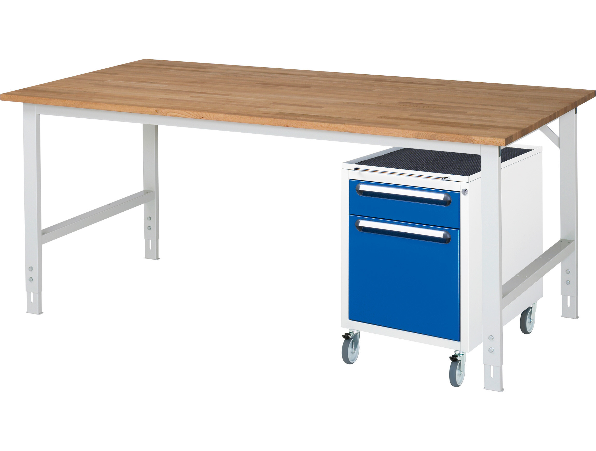 Arbeitstisch Serie Tom (K-Modell 08) B2000 x T1000 x H760-1080 mm Buche-Massiv-Platte 25 mm. Gestell 60x30 mm, Arbeitshöhe verstellbar. Roll-Container mit 3 x Schublade auf rollengelagerten Auszugsschienen (1xH120, 1xH360 mm). Pulverbeschichtung Flächenlast max. 500 kg Lieferung zerlegt - einfachste Montage Qualitätsgarantie 5 Jahre Made in Germany