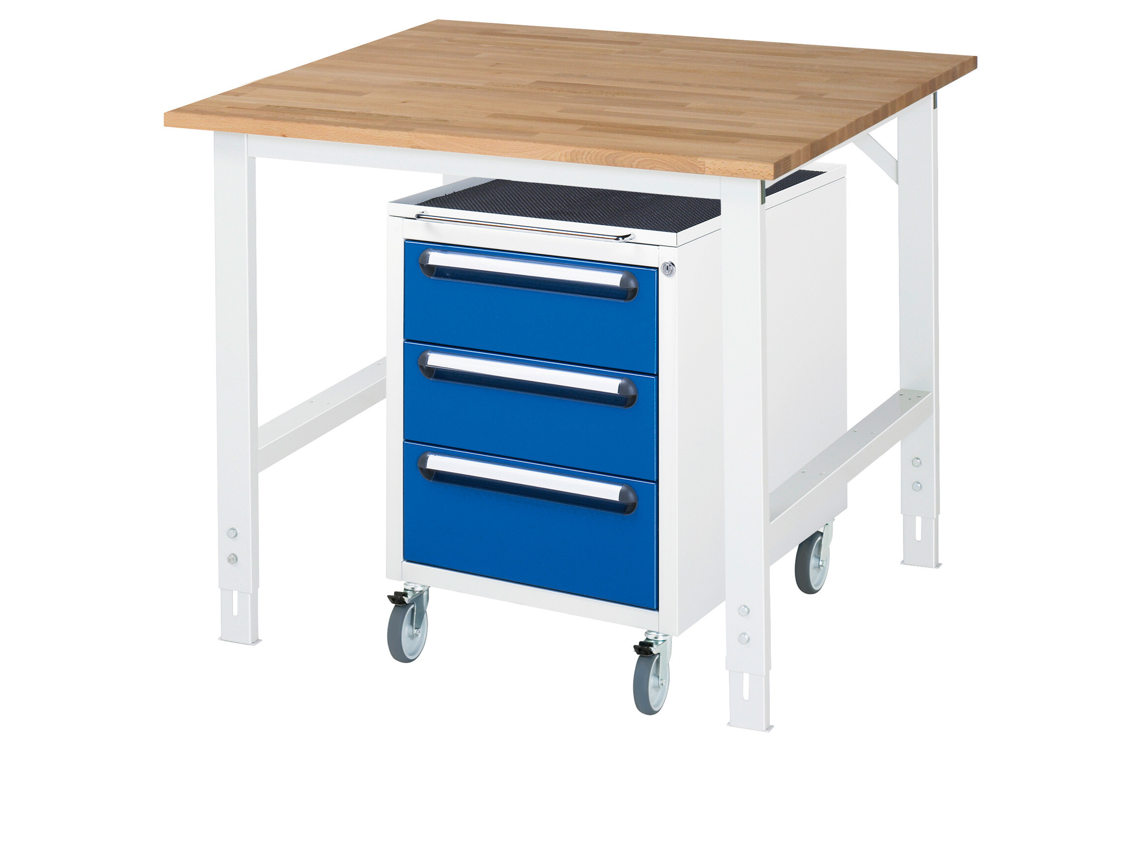 Arbeitstisch Serie Tom (K-Modell 09) B1000 x T1000 x H760-1080 mm Buche-Massiv-Platte 25 mm. Gestell 60x30 mm, Arbeitshöhe verstellbar. Roll-Container mit 3 x Schublade 2x150, 1x180 mm Pulverbeschichtung Flächenlast max. 500 kg Lieferung zerlegt - einfachste Montage Qualitätsgarantie 5 Jahre Made in Germany