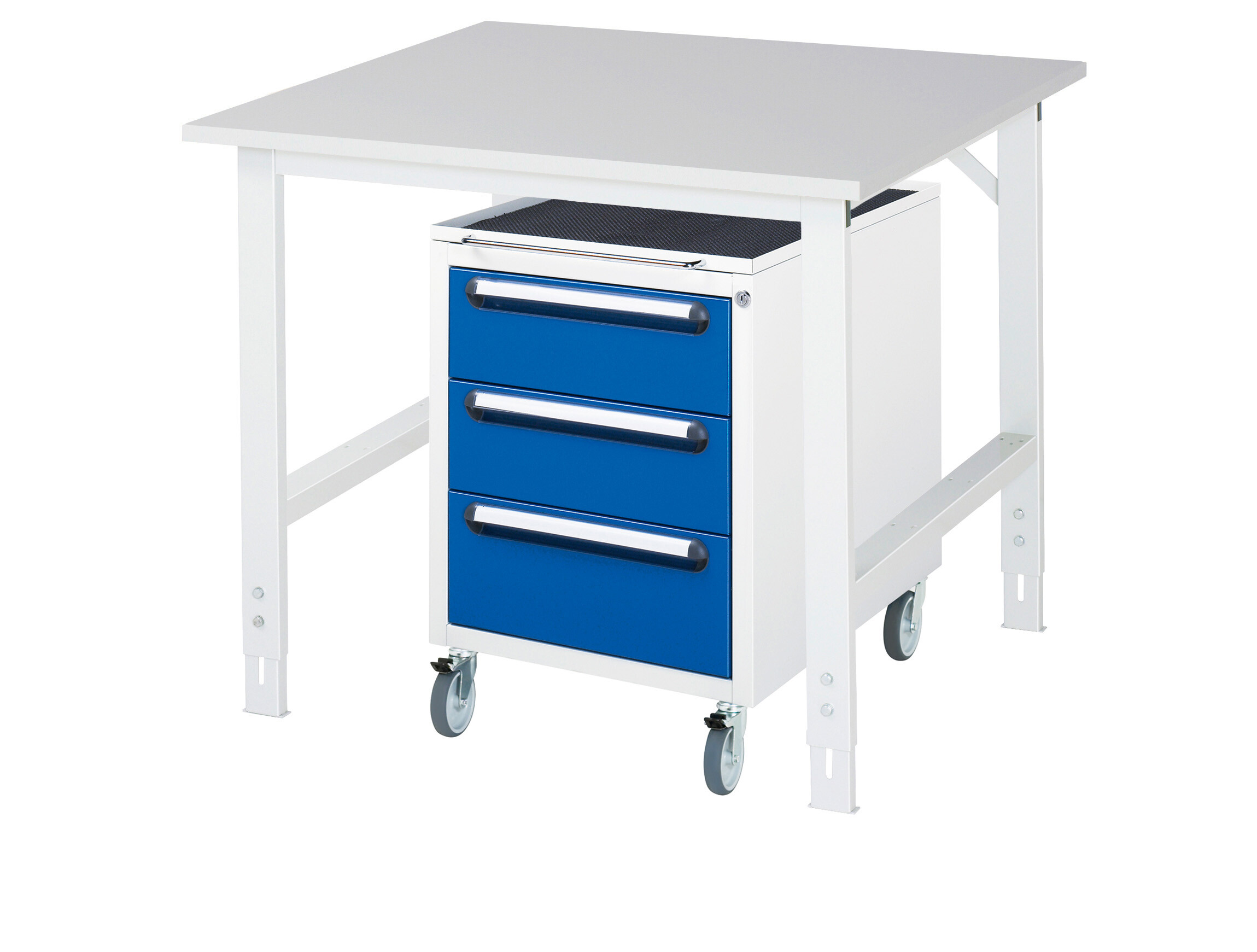 Arbeitstisch Serie Tom (K-Modell 09) B1000 x T1000 x H760-1080 mm Melamin-Platte 22 mm. Gestell 60x30 mm, Arbeitshöhe verstellbar. Roll-Container mit 3 x Schublade 2x150, 1x180 mm Pulverbeschichtung Flächenlast max. 500 kg Lieferung zerlegt - einfachste Montage Qualitätsgarantie 5 Jahre Made in Germany