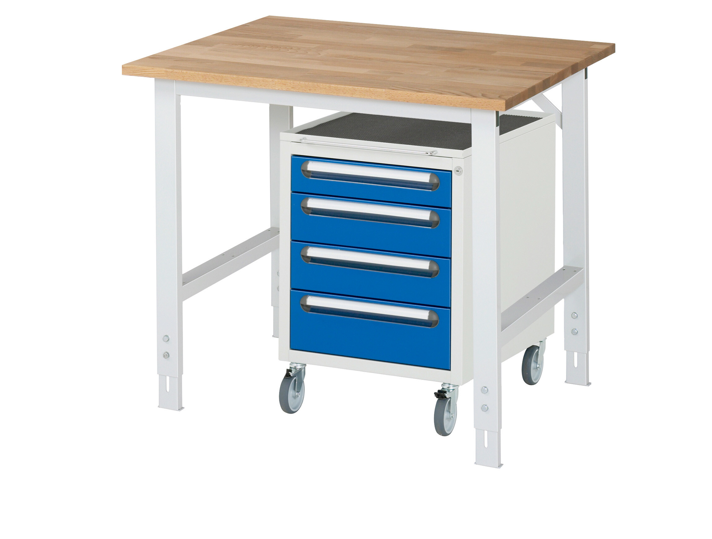 Arbeitstisch Serie Tom (K-Modell 10) B1000 x T800 x H760-1080 mm Buche-Massiv-Platte 25 mm. Gestell 60x30 mm, Arbeitshöhe verstellbar. Roll-Container mit 3 x Schublade auf rollengelagerten Auszugsschienen (1x90, 2xH120, 1xH150 mm). Pulverbeschichtung Flächenlast max. 500 kg Lieferung zerlegt - einfachste Montage Qualitätsgarantie 5 Jahre Made in Germany