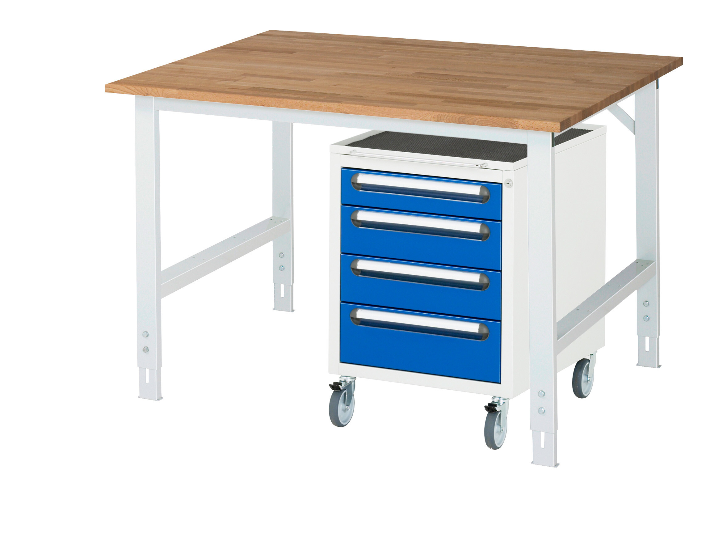 Arbeitstisch Serie Tom (K-Modell 10) B1250 x T1000 x H760-1080 mm Buche-Massiv-Platte 25 mm. Gestell 60x30 mm, Arbeitshöhe verstellbar. Roll-Container mit 4 x Schublade 1x90, 2x120, 1x150 mm Pulverbeschichtung Flächenlast max. 500 kg Lieferung zerlegt - einfachste Montage Qualitätsgarantie 5 Jahre Made in Germany