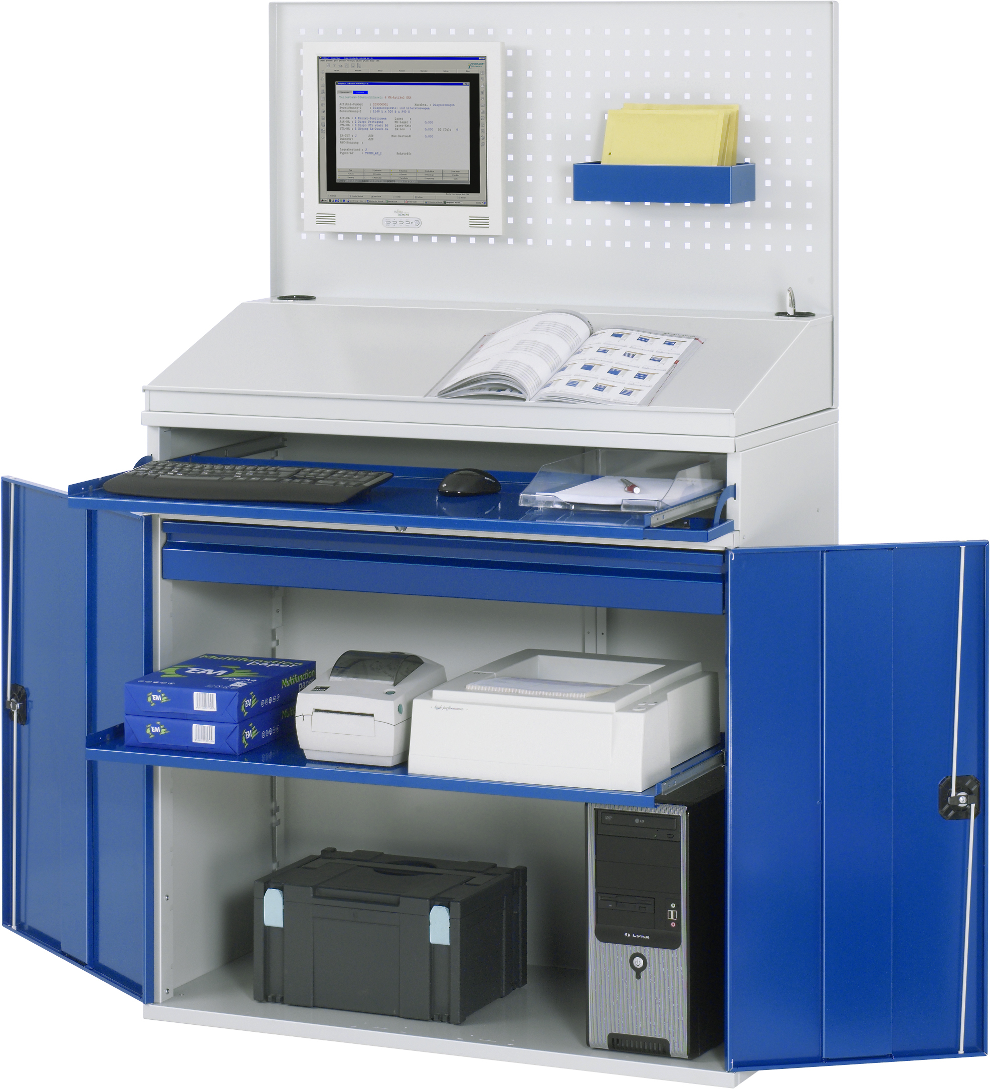 Computer-Schrank - Modell 61-stationär B1100 x T520 x H1770 mm mit 1 x Lochplatte 1 x Schreibaufsatz mit Klappdeckel 1 x Tastaturauszug mit Frontklappe 1 x Innenschublade 1 x Auszugstablar Pulverbeschichtung Belastbarkeit gesamt max. 200 kg Lieferung komplett montiert Qualitätsgarantie 5 Jahre Made in Germany