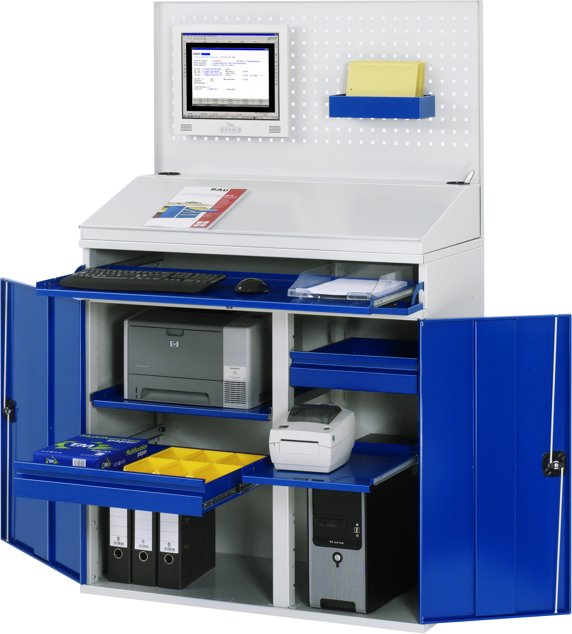Computer-Schrank - Modell 61T-stationär B1100 x T520 x H1770 mm mit 1 x Lochplatte 1 x Schreibaufsatz mit Klappdeckel 1 x Tastaturauszug mit Frontklappe 1 x Auszugstablar (links) 1 x Innenschublade (links) 1 x Innenschublade (rechts) 1 x Auszugstablar (rechts) Pulverbeschichtung Belastbarkeit gesamt max. 200 kg Lieferung komplett montiert Qualitätsgarantie 5 Jahre Made in Germany