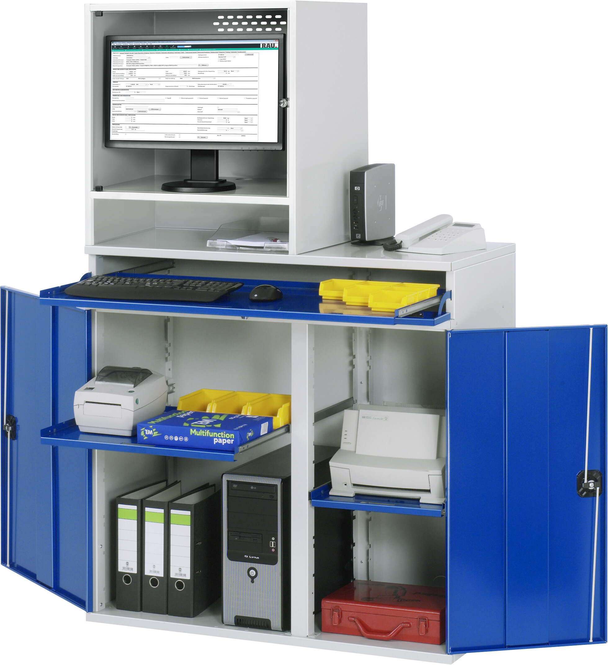 Computer-Schrank - Modell 65T-stationär B1100 x T520 x H1060 mm mit 1 x Monitorgehäuse T520 mm (links) 1 x Tastaturauszug mit Frontklappe 1 x Auszugstablar (links) 1 x Auszugstablar (rechts) Pulverbeschichtung Belastbarkeit gesamt max. 200 kg Lieferung komplett montiert Qualitätsgarantie 5 Jahre Made in Germany