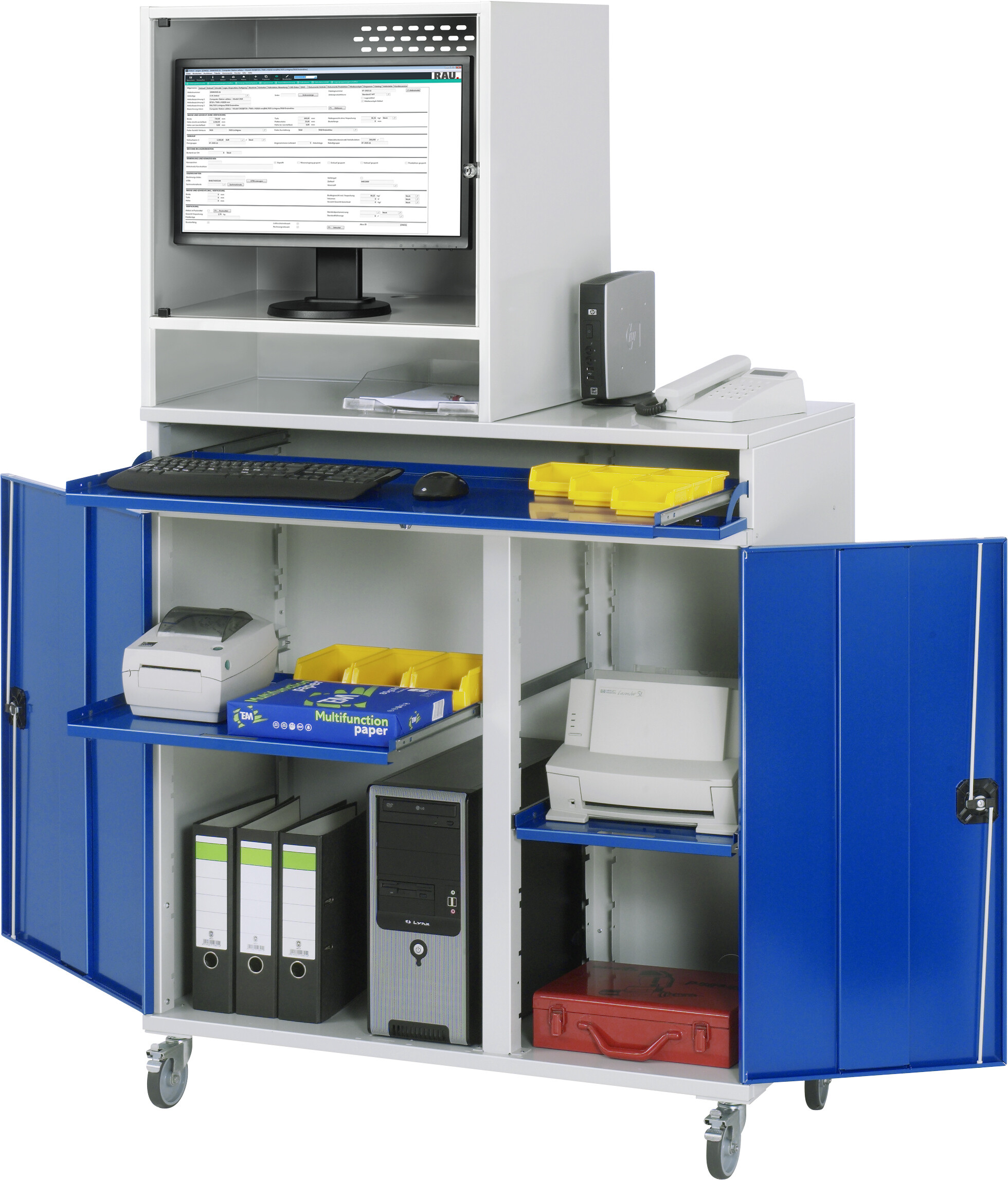 Computer-Schrank - Modell 65T-mobil B1100 x T520 x H1185 mm mit 1 x Monitorgehäuse T520 mm (links) 1 x Tastaturauszug mit Frontklappe 1 x Auszugstablar (links) 1 x Auszugstablar (rechts) Radsatz: 4 Lenkrollen, 2 mit Feststeller. Pulverbeschichtung Belastbarkeit gesamt max. 200 kg Lieferung komplett montiert Qualitätsgarantie 5 Jahre Made in Germany