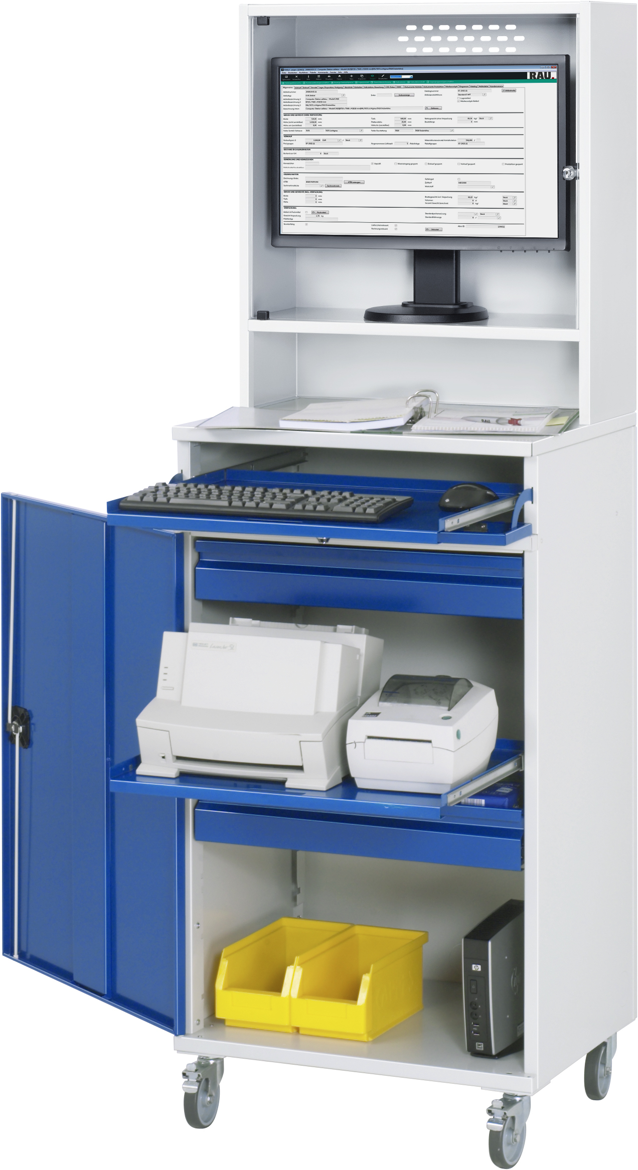 Computer-Schrank - Modell 66-mobil B650 x T520 x H1895 mm mit 1 x Monitorgehäuse T250 mm 1 x Tastaturauszug mit Frontklappe 2 x Innenschublade 1 x Auszugstablar Radsatz: 4 Lenkrollen, 2 mit Feststeller. Pulverbeschichtung Belastbarkeit gesamt max. 200 kg Lieferung komplett montiert Qualitätsgarantie 5 Jahre Made in Germany