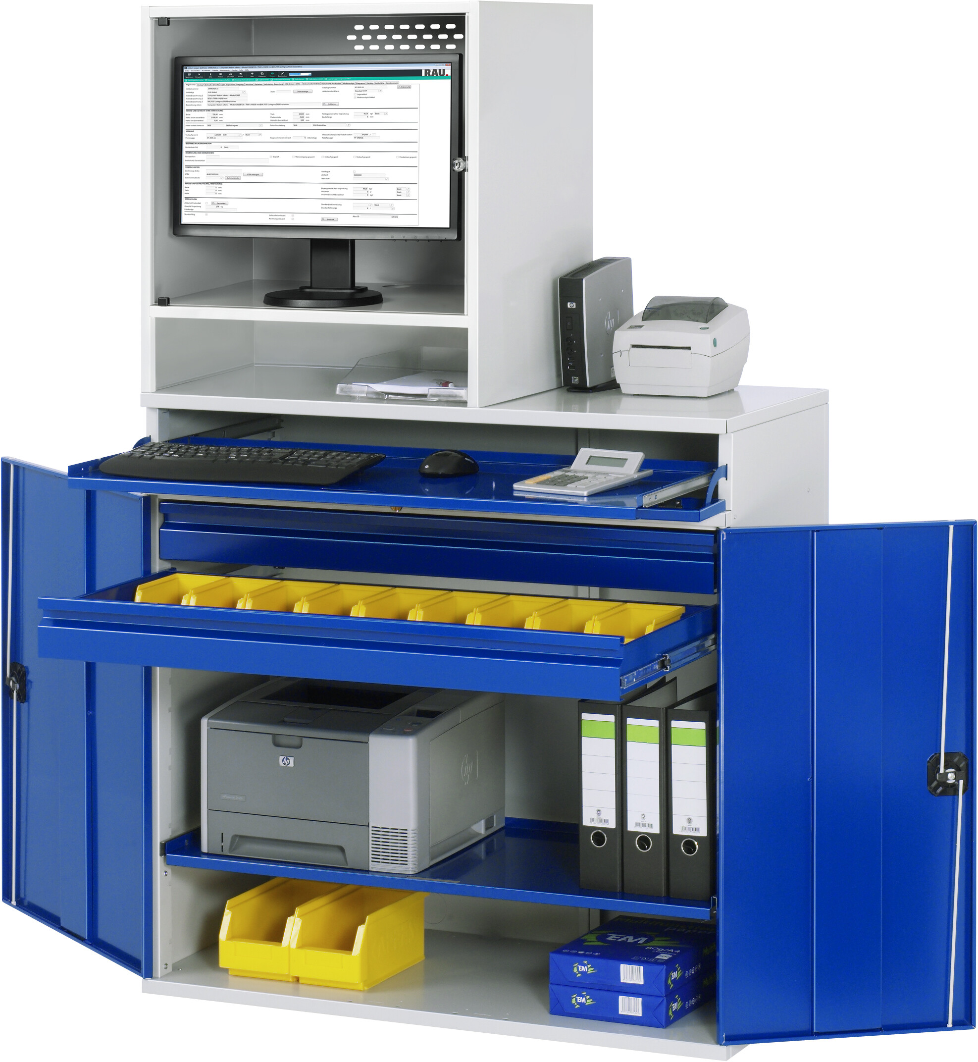 Computer-Schrank - Modell 66-stationär B1100 x T520 x H1770 mm mit 1 x Monitorgehäuse T520 mm (links) 1 x Tastaturauszug mit Frontklappe 2 x Innenschublade 1 x Auszugstablar Pulverbeschichtung Belastbarkeit gesamt max. 200 kg Lieferung komplett montiert Qualitätsgarantie 5 Jahre Made in Germany