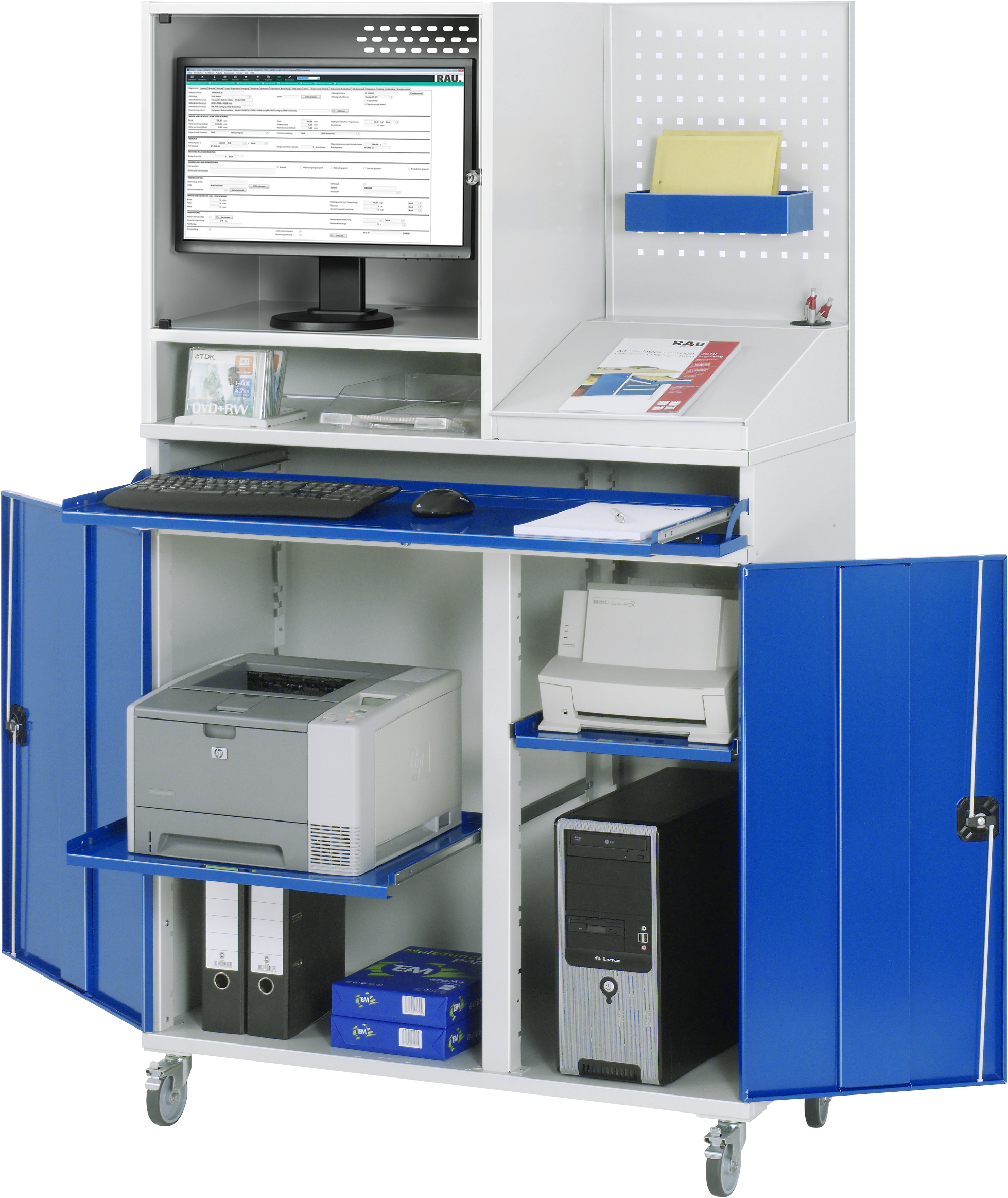 Computer-Schrank - Modell 67T-mobil B1100 x T520 x H1895 mm mit 1 x Monitorgehäuse T520 mm (links) 1 x Lochplatte (rechts) 1 x Schreibaufsatz mit Klappdeckel (rechts) 1 x Tastaturauszug mit Frontklappe 1 x Auszugstablar (links) 1 x Auszugstablar (rechts) Radsatz: 4 Lenkrollen, 2 mit Feststeller. Pulverbeschichtung Belastbarkeit gesamt max. 200 kg Lieferung komplett montiert Qualitätsgarantie 5 Jahre Made in Germany