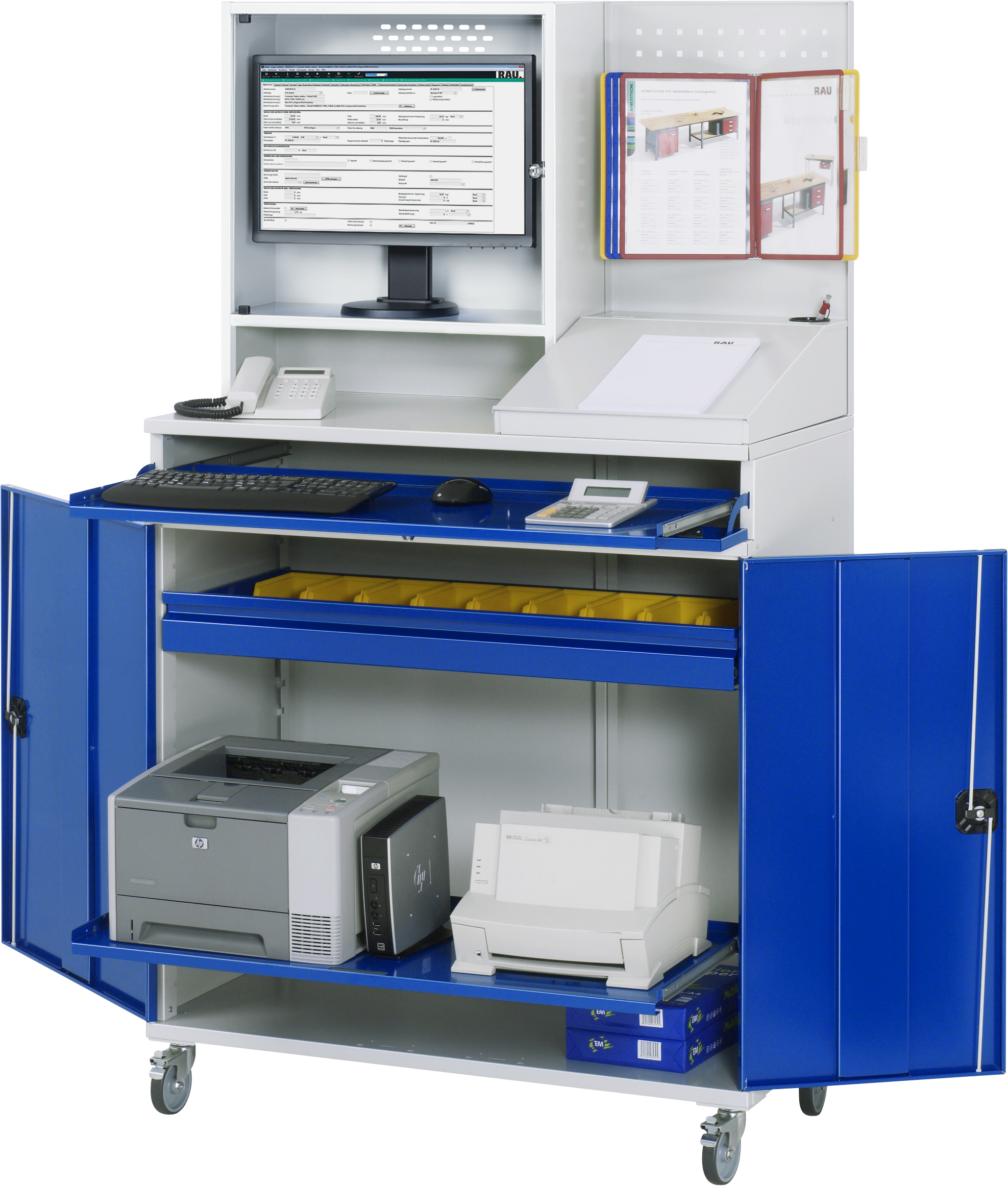 Computer-Schrank - Modell 69-mobil B1100 x T520 x H1895 mm mit 1 x Monitorgehäuse T250 mm (links) 1 x Lochplatte (rechts) 1 x Schreibaufsatz mit Klappdeckel (rechts) 1 x Tastaturauszug mit Frontklappe 1 x Innenschublade 1 x Auszugstablar Radsatz: 4 Lenkrollen, 2 mit Feststeller. Pulverbeschichtung Belastbarkeit gesamt max. 200 kg Lieferung komplett montiert Qualitätsgarantie 5 Jahre Made in Germany