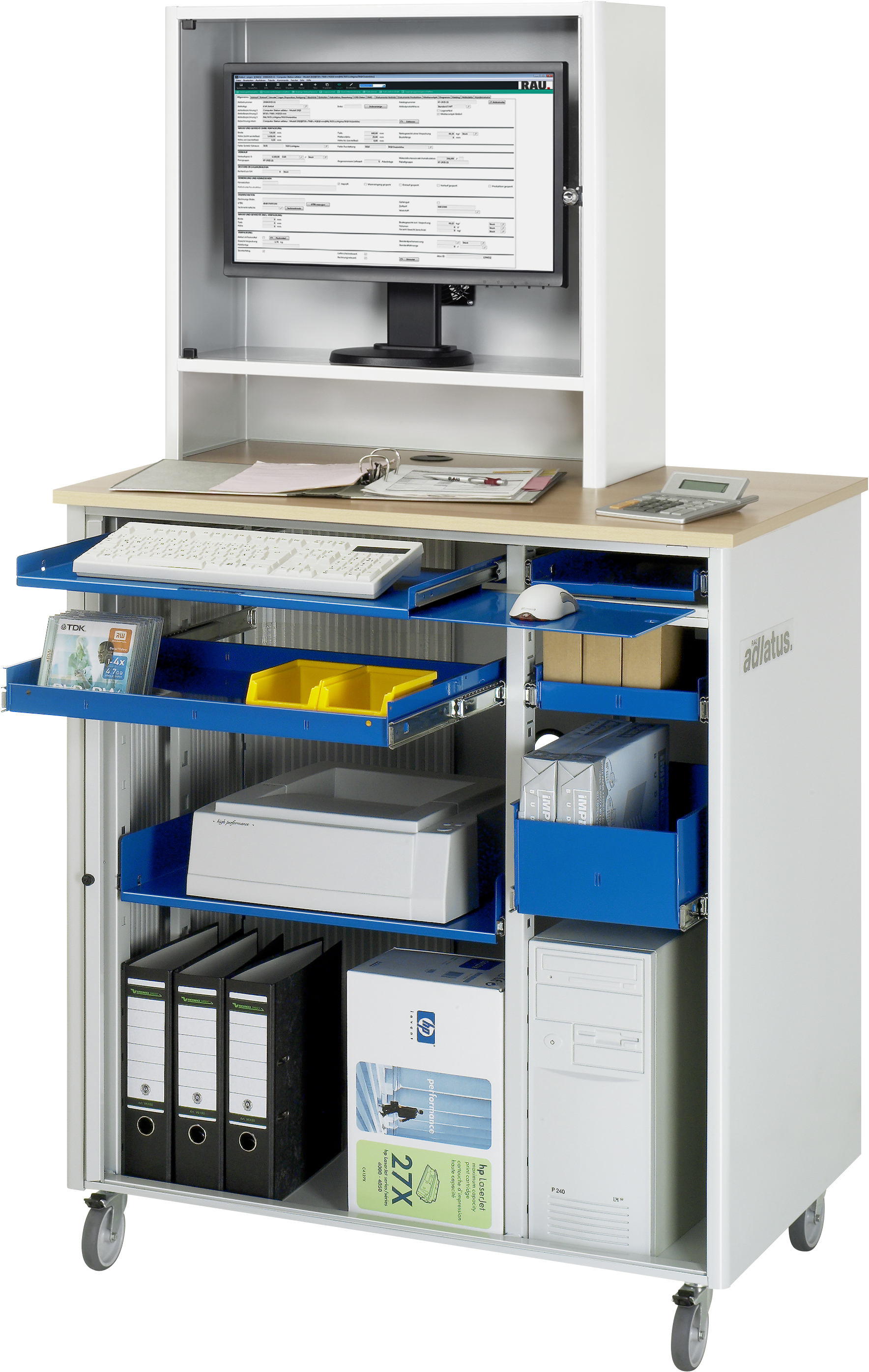 Computer-Station - Modell 2665-mobil B1030 x T660 x H1850 mm mit 1 x Monitorgehäuse T300 mm mit Gerätelüfter Tastaturtablar mit Mausauflage 1 x Schublade (1xH65 mm) (links) 1 x Druckertablar (links) 1 x Maustablar (rechts) 1 x Schublade (1xH65 mm) (rechts) 1 x Schublade (1xH195 mm)(rechts) 4-fach Steckdosenleiste Radsatz: 4 Lenkrollen, 2 mit Feststeller. Pulverbeschichtung Belastbarkeit gesamt max. 200 kg Lieferung komplett montiert Qualitätsgarantie 5 Jahre Made in Germany