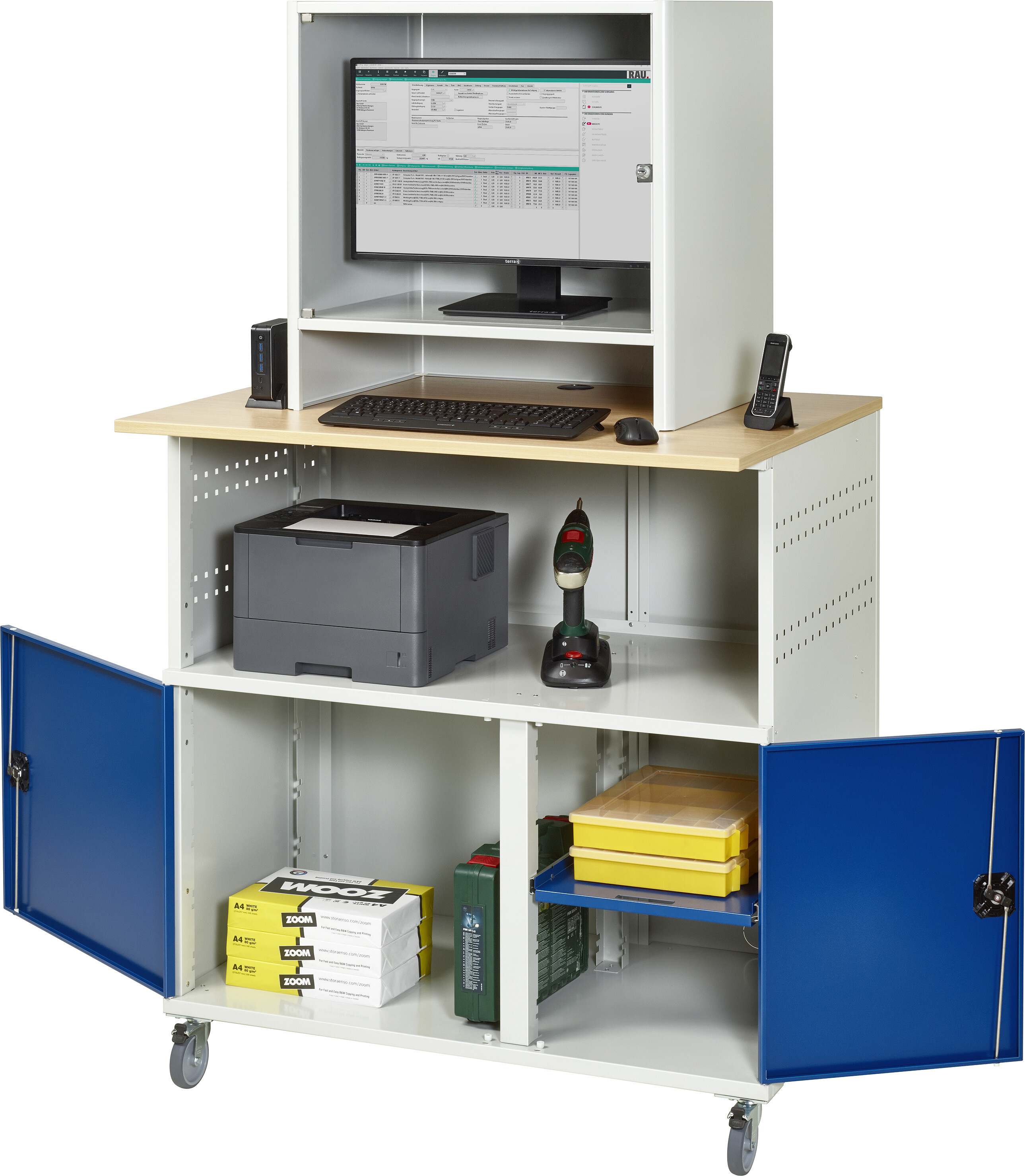 Computer-Tisch - Modell 1023 - mobil B1100 x T790 x H1890 mm mit 2-flügliges Türfach 1 x Mittelwand 1 x Fachboden verstellbar 3-fach Steckdosenleiste. Radsatz: 4 Lenkrollen, 2 mit Feststeller. Pulverbeschichtung Belastbarkeit gesamt max. 200 kg Lieferung komplett montiert Qualitätsgarantie 5 Jahre Made in Germany