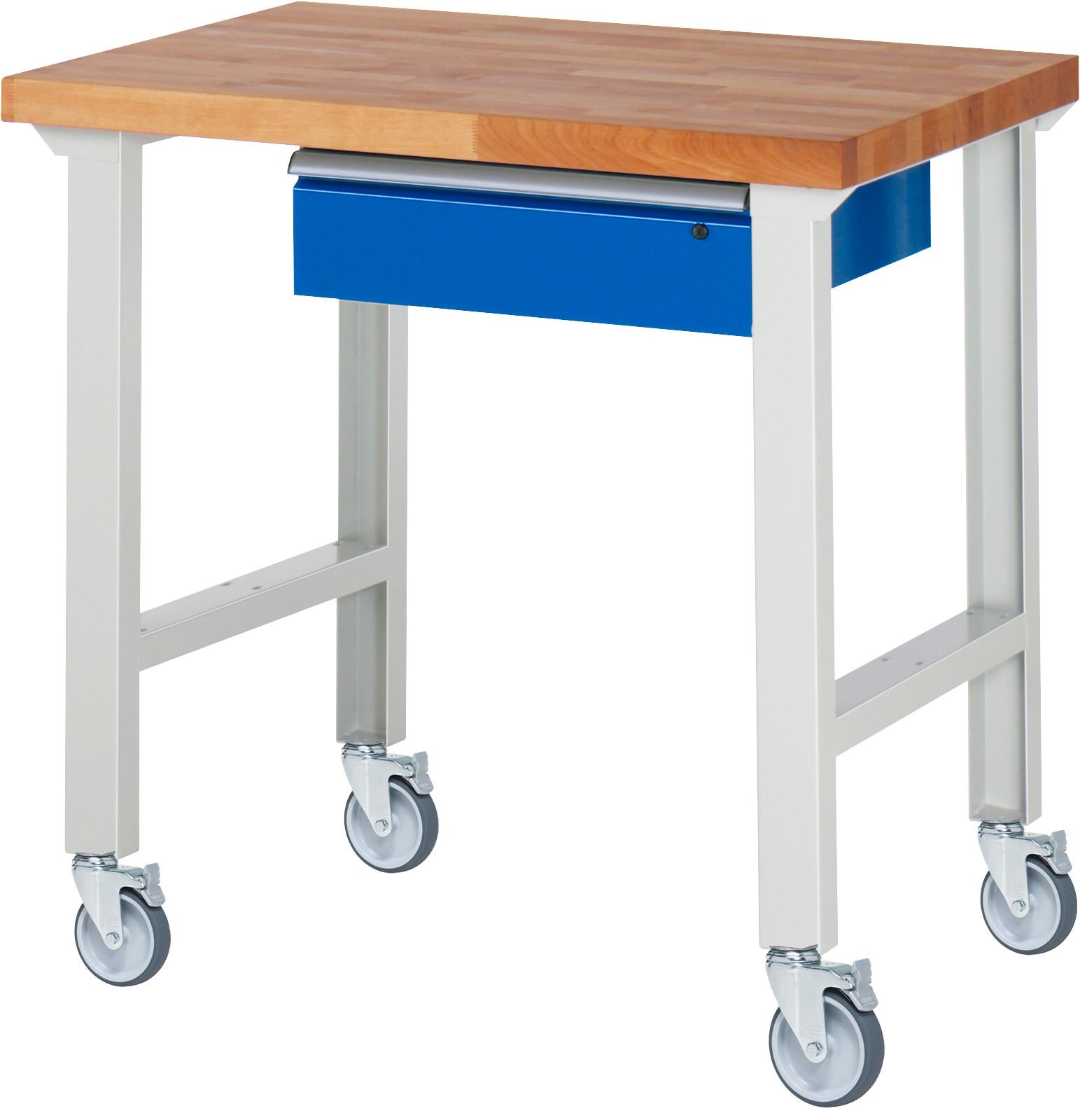 Fahrbare Werkbank 7000 - Modell 7001 4 B1000 x T700 x H1000 mm Buche-Massiv-Platte 40 mm. 1 x Schublade (1xH150 mm). Pulverbeschichtung Belastbarkeit gesamt max. 200 kg Lieferung komplett montiert Qualitätsgarantie 5 Jahre Made in Germany