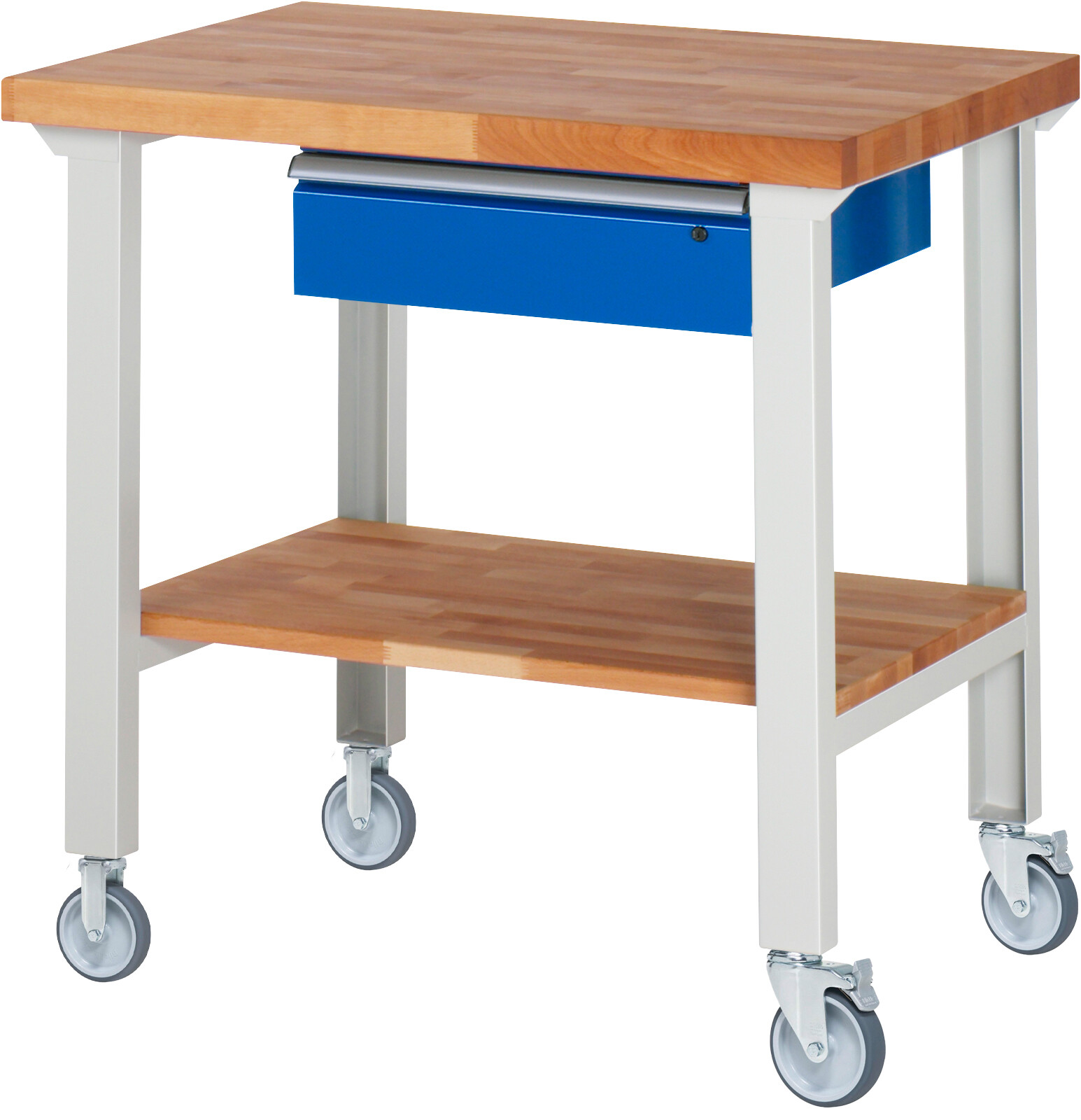 Fahrbare Werkbank 7000 - Modell 7001 22 B1000 x T700 x H1000 mm Buche-Massiv-Platte 40 mm. 1 x Schublade (1xH150 mm). Werkbank mit Buche-Massiv-Ablageboden (T 545 mm). Pulverbeschichtung Belastbarkeit gesamt max. 200 kg Lieferung komplett montiert Qualitätsgarantie 5 Jahre Made in Germany