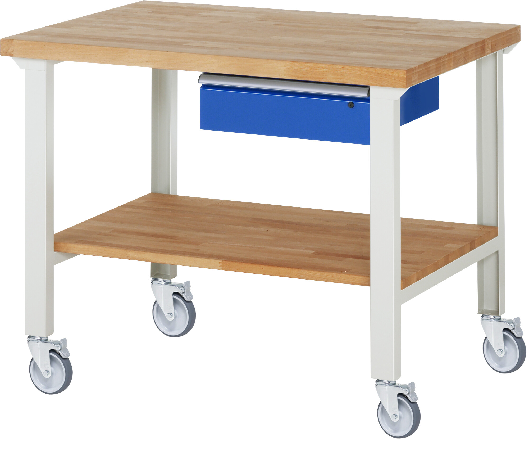 Fahrbare Werkbank 7000 - Modell 7001 4 B1250 x T900 x H1000 mm Buche-Massiv-Platte 40 mm. 1 x Schublade (1xH150 mm). Werkbank mit Buche-Massiv-Ablageboden (T 745 mm). Pulverbeschichtung Belastbarkeit gesamt max. 200 kg Lieferung komplett montiert Qualitätsgarantie 5 Jahre Made in Germany