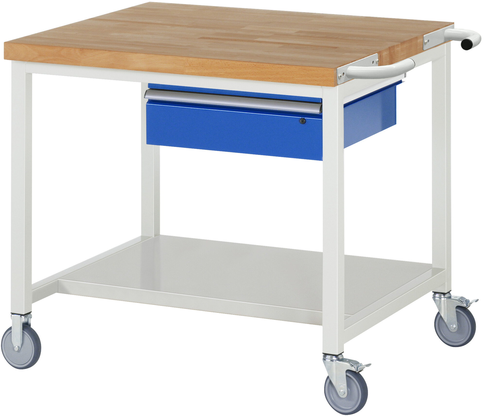 Fahrbare Werkbank 8000 - Modell 8001 B1000 x T900 x H880-1080 mm Buche-Massiv-Arbeitsplatte 40 mm. Gestell Vierkantrohr mit Stahlblech-Ablageboden (T 650 mm). 2 Bock- und 2 Lenkrollen mit Feststeller. 1 x Schublade auf rollengelagerten Auszugsschienen (1xH150 mm). Pulverbeschichtung Flächenlast max. 450 kg Lieferung komplett montiert Qualitätsgarantie 5 Jahre Made in Germany