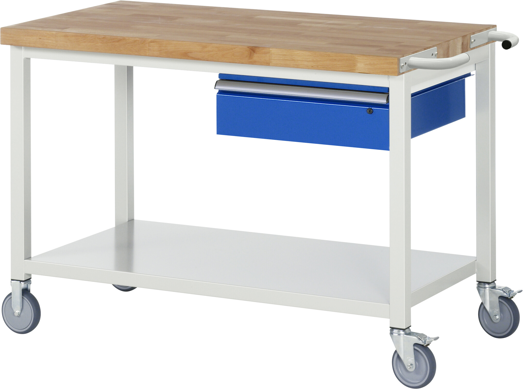 Fahrbare Werkbank 8000 - Modell 8001 B1250 x T700 x H880-1080 mm Buche-Massiv-Arbeitsplatte 40 mm. Gestell Vierkantrohr mit Stahlblech-Ablageboden (T 650 mm). 2 Bock- und 2 Lenkrollen mit Feststeller. 1 x Schublade auf rollengelagerten Auszugsschienen (1xH150 mm). Pulverbeschichtung Flächenlast max. 450 kg Lieferung komplett montiert Qualitätsgarantie 5 Jahre Made in Germany