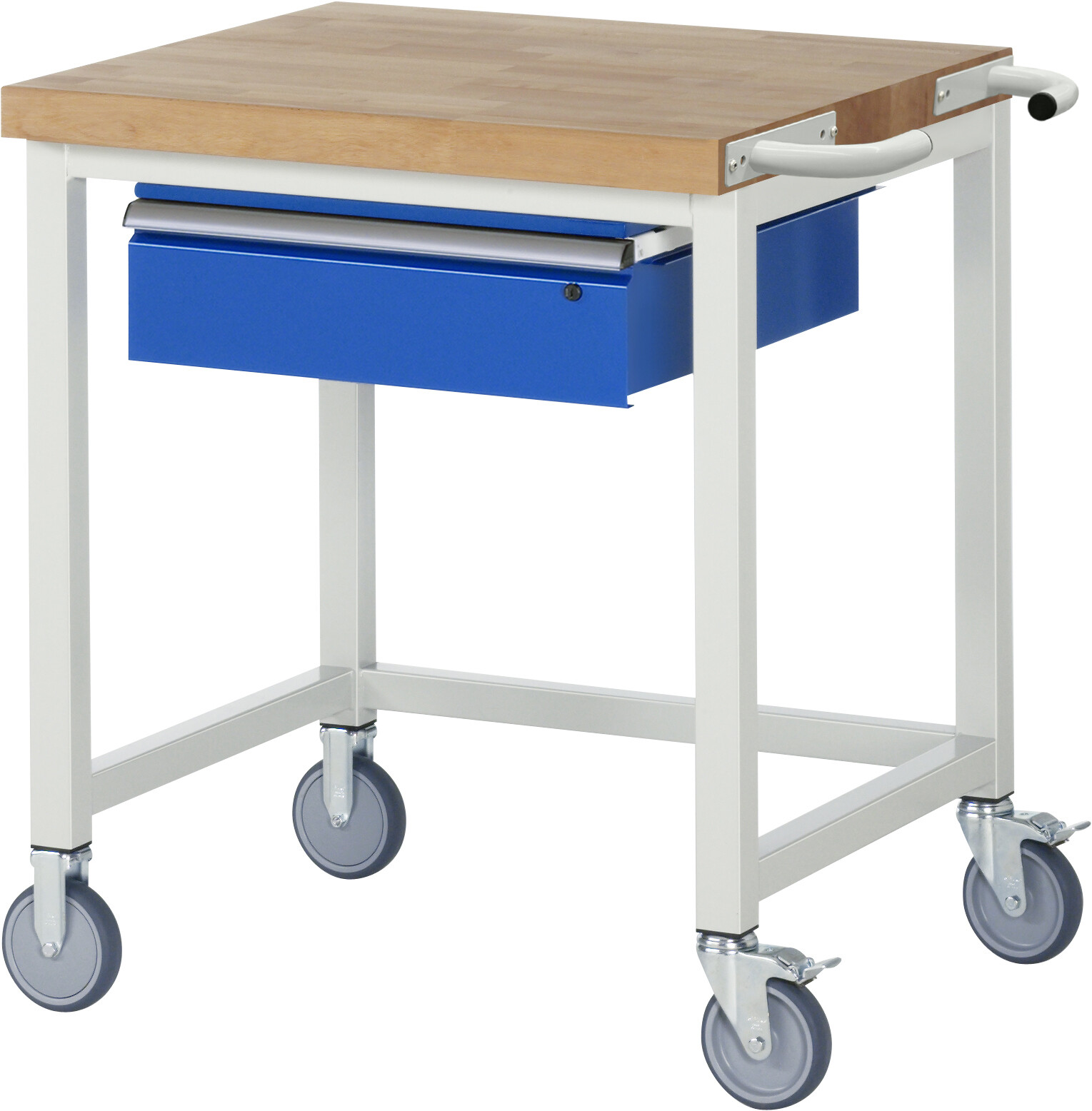 Fahrbare Werkbank 8000 - Modell 8001 B750 x T700 x H880-1080 mm Buche-Massiv-Arbeitsplatte 40 mm. Gestell Vierkantrohr. 2 Bock- und 2 Lenkrollen mit Feststeller. 1 x Schublade auf rollengelagerten Auszugsschienen (1xH150 mm). Pulverbeschichtung Flächenlast max. 450 kg Lieferung komplett montiert Qualitätsgarantie 5 Jahre Made in Germany