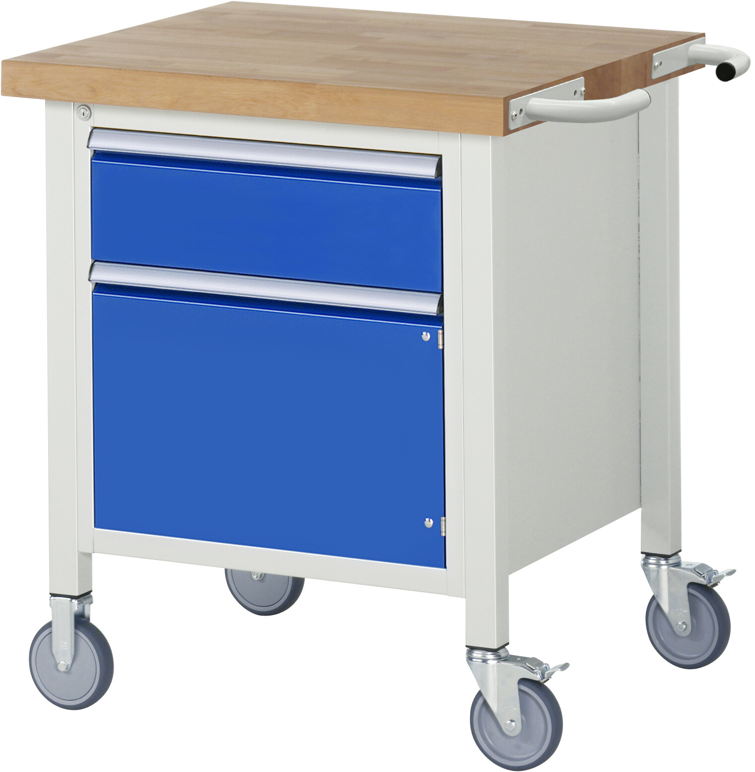 Fahrbare Werkbank 8000 - Modell 8152 B750 x T700 x H880 mm Buche-Massiv-Arbeitsplatte 40 mm. Gestell Vierkantrohr. 2 Bock- und 2 Lenkrollen mit Feststeller. 1 x Schublade (1xH180 mm). 1 x Flügeltür (H360 mm). Pulverbeschichtung Flächenlast max. 450 kg Lieferung komplett montiert Qualitätsgarantie 5 Jahre Made in Germany