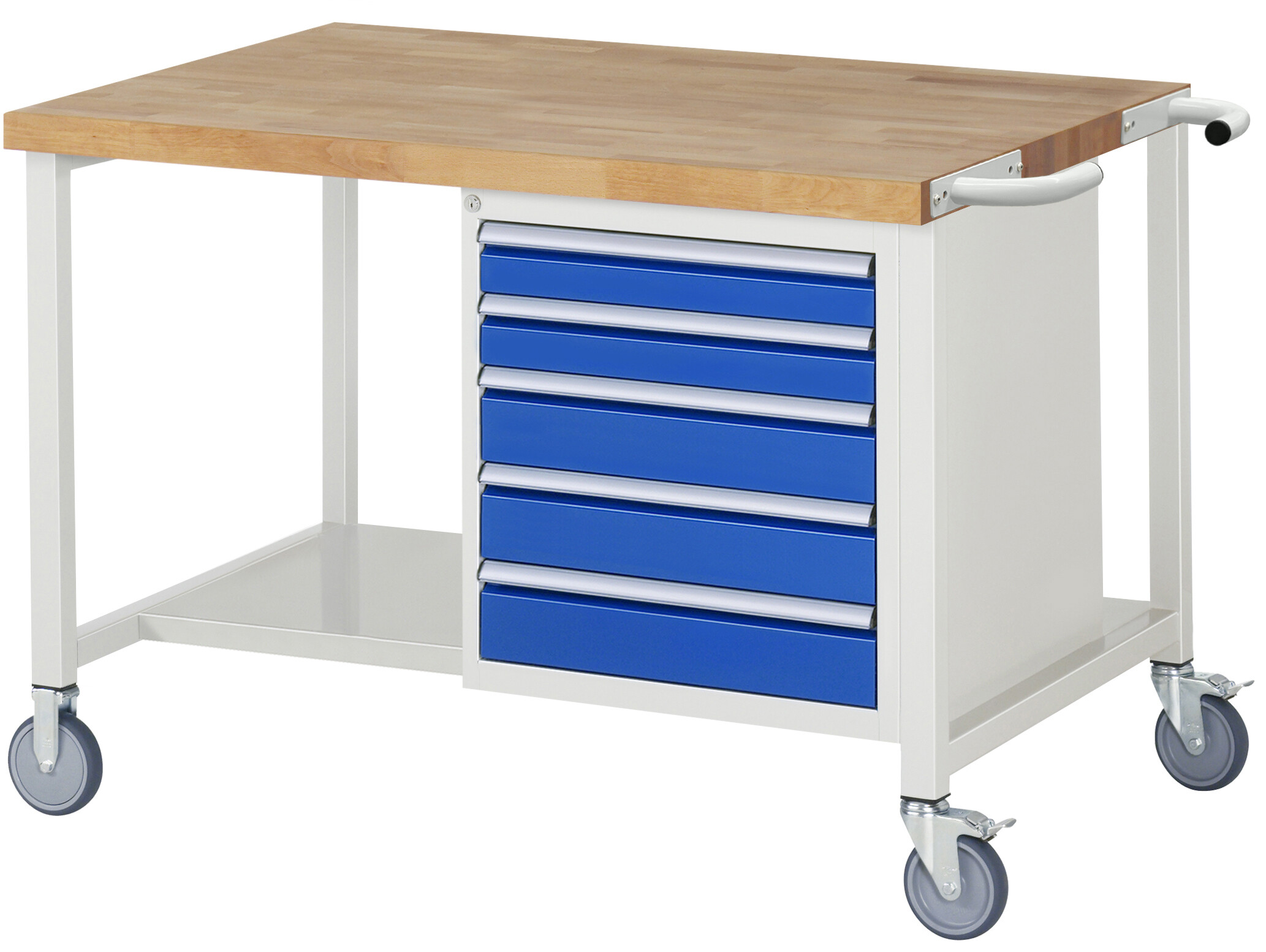 Fahrbare Werkbank 8000 - Modell 8171 B1250 x T900 x H880 mm Buche-Massiv-Arbeitsplatte 40 mm. Gestell Vierkantrohr mit Stahlblech-Ablageboden (T 650 mm). 2 Bock- und 2 Lenkrollen mit Feststeller. 5 x Schublade (2xH90, 3xH120 mm). Pulverbeschichtung Flächenlast max. 450 kg Lieferung komplett montiert Qualitätsgarantie 5 Jahre Made in Germany
