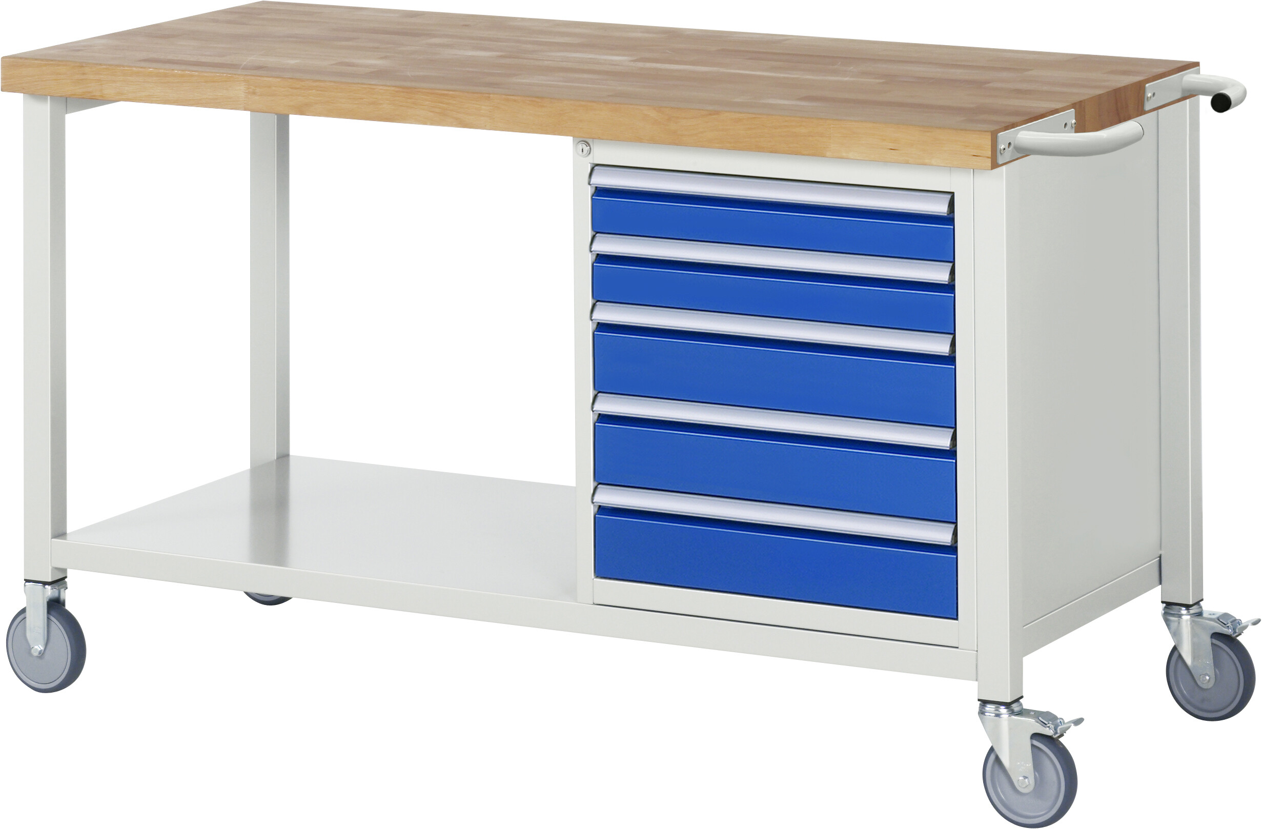 Fahrbare Werkbank 8000 - Modell 8171 B1500 x T700 x H880 mm Buche-Massiv-Arbeitsplatte 40 mm. Gestell Vierkantrohr mit Stahlblech-Ablageboden (T 650 mm). 2 Bock- und 2 Lenkrollen mit Feststeller. 5 x Schublade (2xH90, 3xH120 mm). Pulverbeschichtung Flächenlast max. 450 kg Lieferung komplett montiert Qualitätsgarantie 5 Jahre Made in Germany