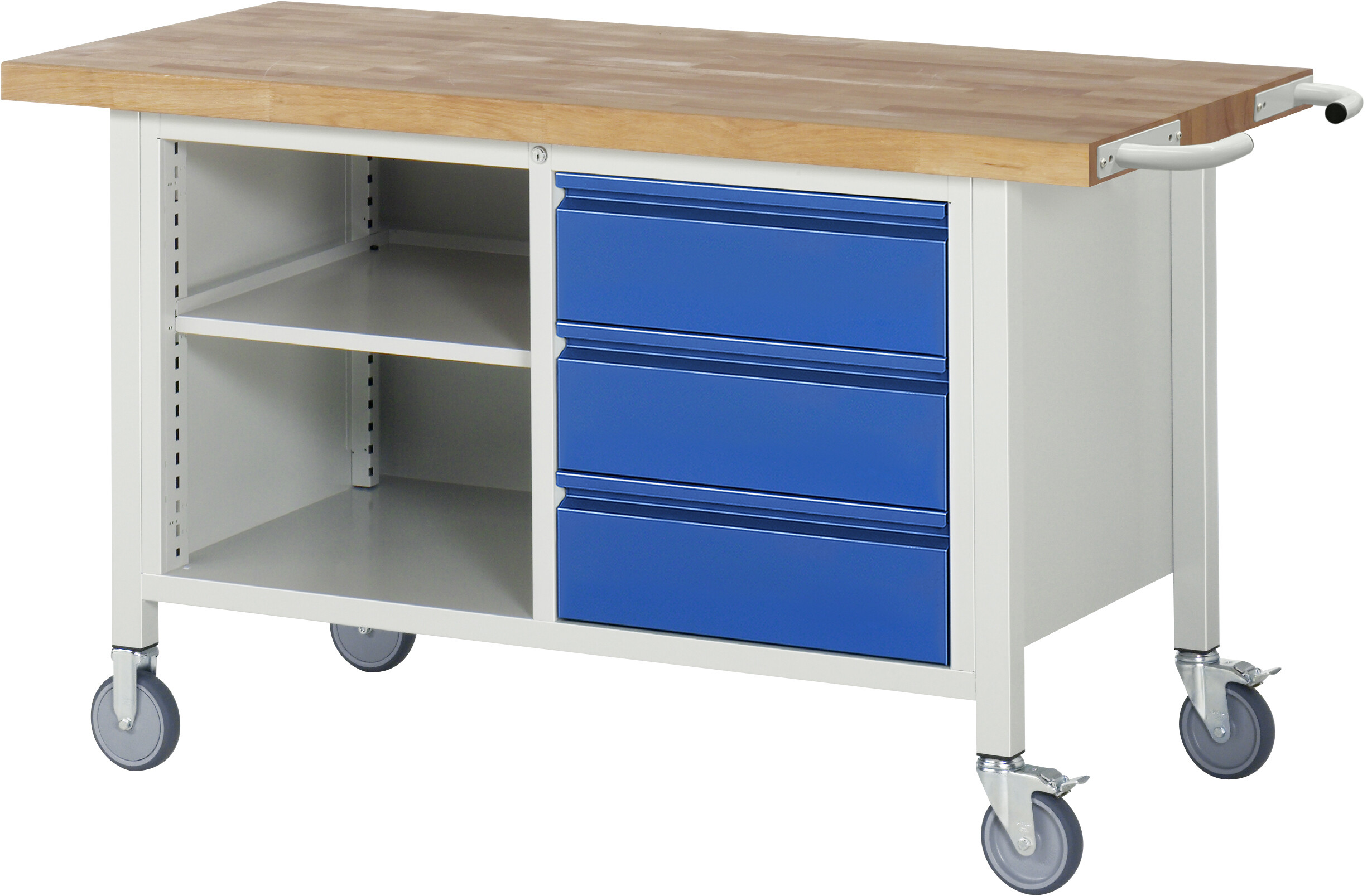Fahrbare Werkbank - Modell 8462 BASIC B1500 x T700 x H880 mm Buche-Massiv-Arbeitsplatte 40 mm. Gestell Vierkantrohr. 2 Bock- und 2 Lenkrollen mit Feststeller. 3 x Schublade auf rollengelagerten Auszugsschienen (3xH180 mm). Offenes Fach mit höhenverstellbarem Fachboden. Pulverbeschichtung Flächenlast max. 450 kg Lieferung komplett montiert Qualitätsgarantie 5 Jahre Made in Germany