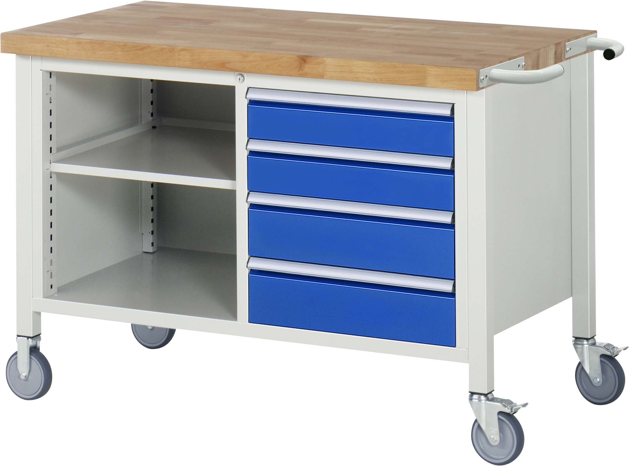 Fahrbare Werkbank 8000 - Modell 8463 B1250 x T700 x H880-1080 mm Buche-Massiv-Arbeitsplatte 40 mm. Gestell Vierkantrohr. 2 Bock- und 2 Lenkrollen mit Feststeller. 4 x Schublade (2xH120, 2xH150 mm). Pulverbeschichtung Flächenlast max. 450 kg Lieferung komplett montiert Qualitätsgarantie 5 Jahre Made in Germany