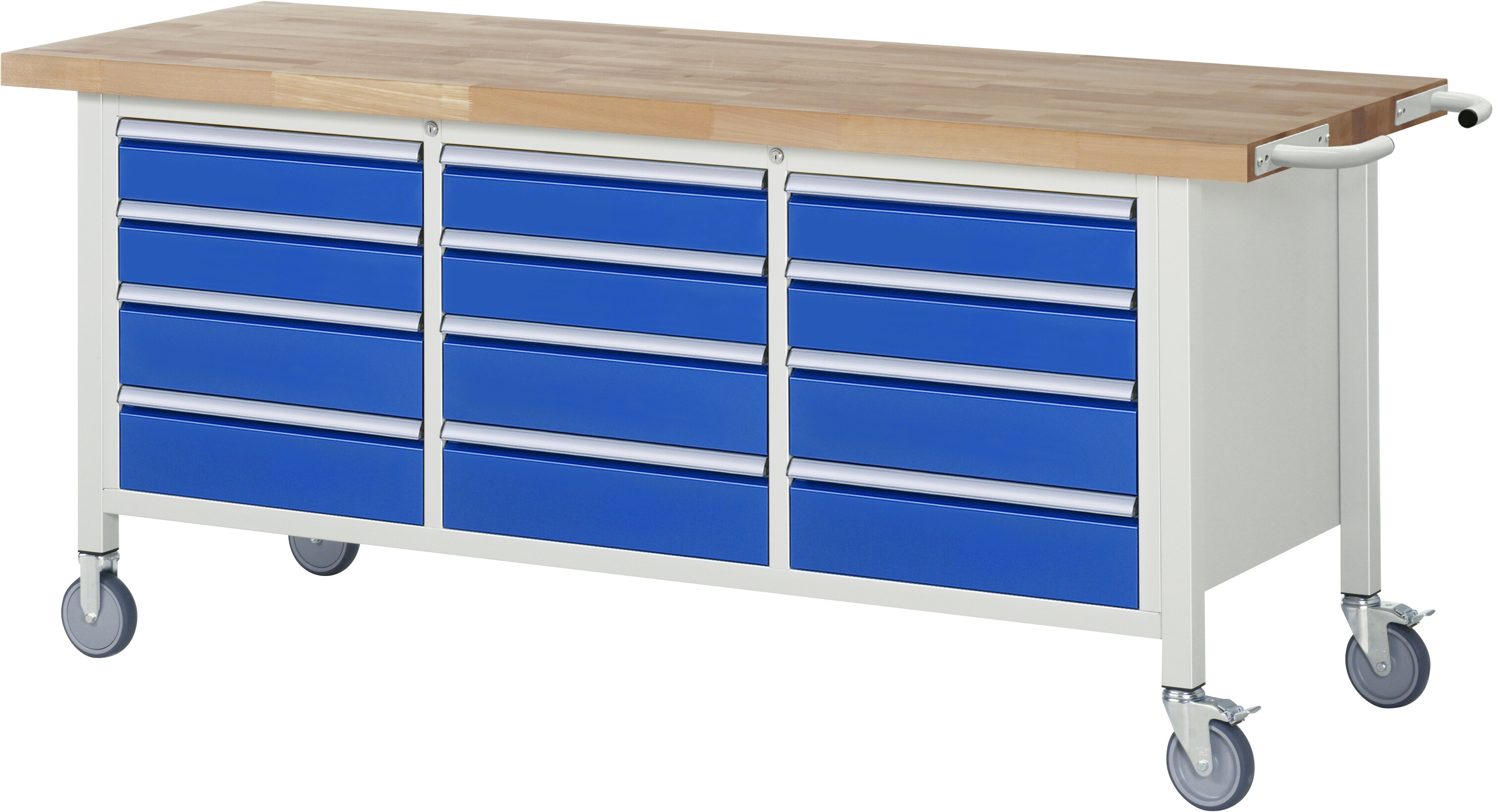 Fahrbare Werkbank 8000 - Modell 8579 B2000 x T700 x H880-1080 mm Buche-Massiv-Arbeitsplatte 40 mm. Gestell Vierkantrohr. 2 Bock- und 2 Lenkrollen mit Feststeller. 12 x Schublade (6xH120, 6xH150 mm). Pulverbeschichtung Flächenlast max. 450 kg Lieferung komplett montiert Qualitätsgarantie 5 Jahre Made in Germany