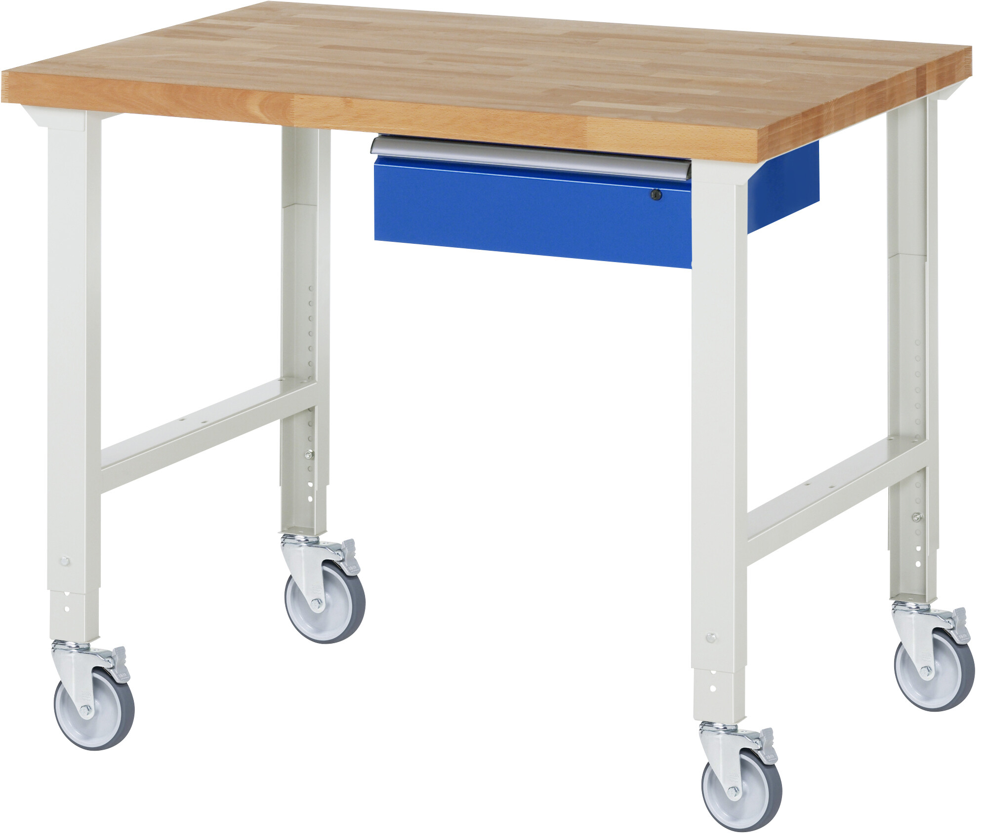 Fahrbare Werkbank 7000 - Modell 7001 4 B1250 x T900 x H950-1000 mm Buche-Massiv-Platte 40 mm. 1 x Schublade (1xH150 mm). Werkbank mit einstellbarer Arbeitshöhe. Pulverbeschichtung Belastbarkeit gesamt max. 200 kg Lieferung komplett montiert Qualitätsgarantie 5 Jahre Made in Germany