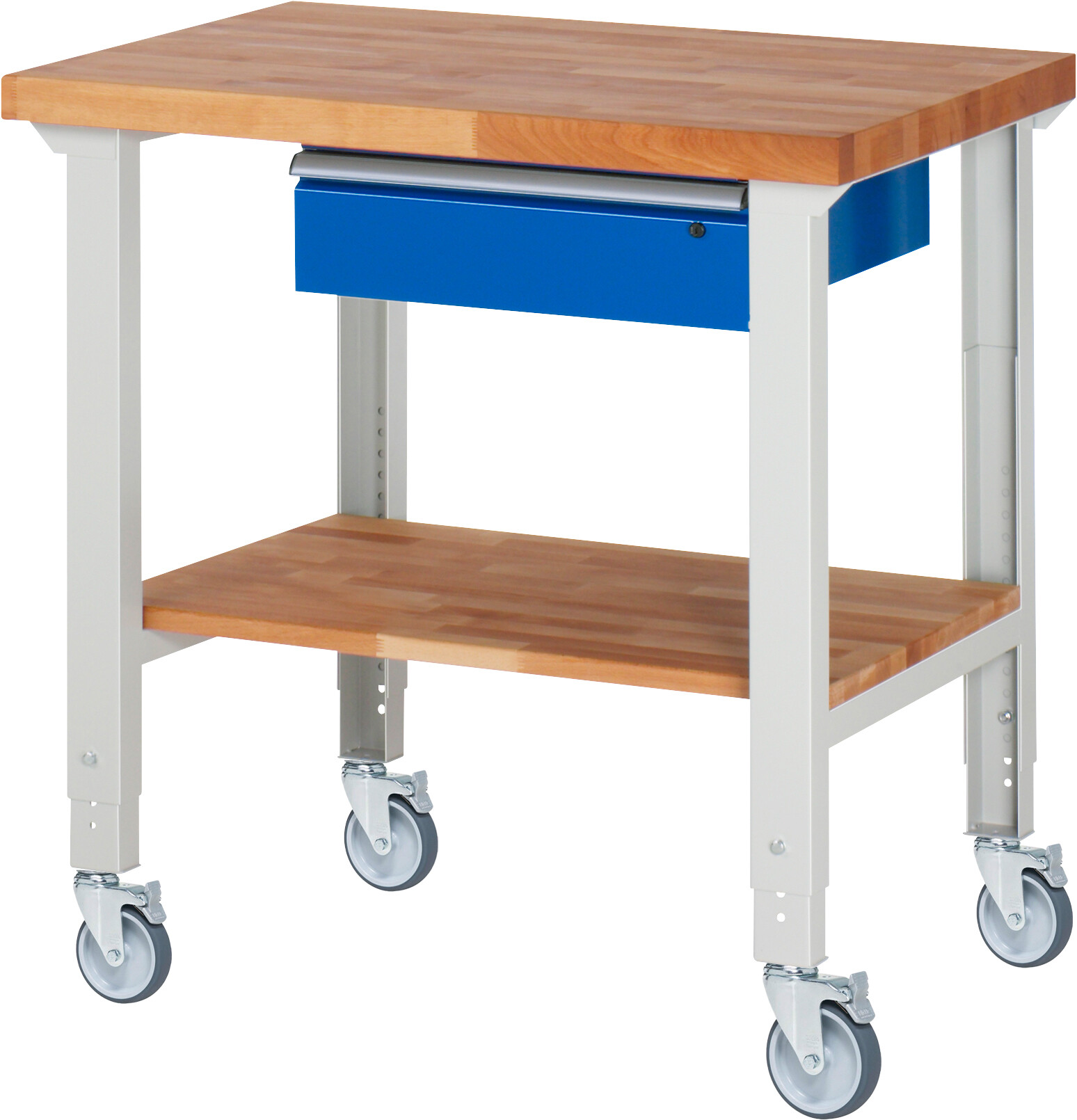 Fahrbare Werkbank 7000 - Modell 7001 4 B1000 x T700 x H950-1000 mm Buche-Massiv-Platte 40 mm. 1 x Schublade (1xH150 mm). Werkbank mit Buche-Massiv-Ablageboden (T 545 mm) und einstellbarer Arbeitshöhe. Pulverbeschichtung Belastbarkeit gesamt max. 200 kg Lieferung komplett montiert Qualitätsgarantie 5 Jahre Made in Germany