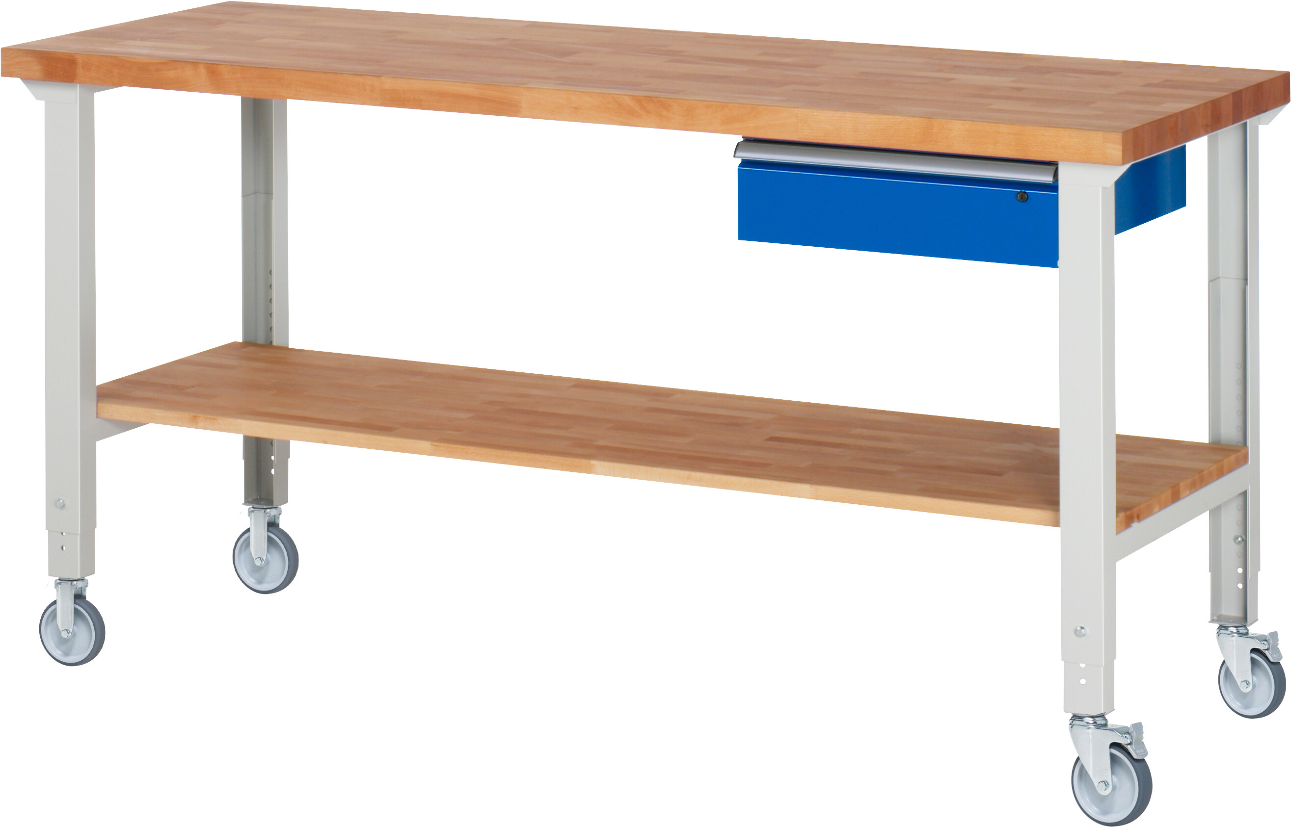 Fahrbare Werkbank 7000 - Modell 7001 22 B2000 x T700 x H950-1000 mm Buche-Massiv-Platte 40 mm. 1 x Schublade (1xH150 mm). Werkbank mit Buche-Massiv-Ablageboden (T 545 mm) und einstellbarer Arbeitshöhe. Pulverbeschichtung Belastbarkeit gesamt max. 200 kg Lieferung komplett montiert Qualitätsgarantie 5 Jahre Made in Germany