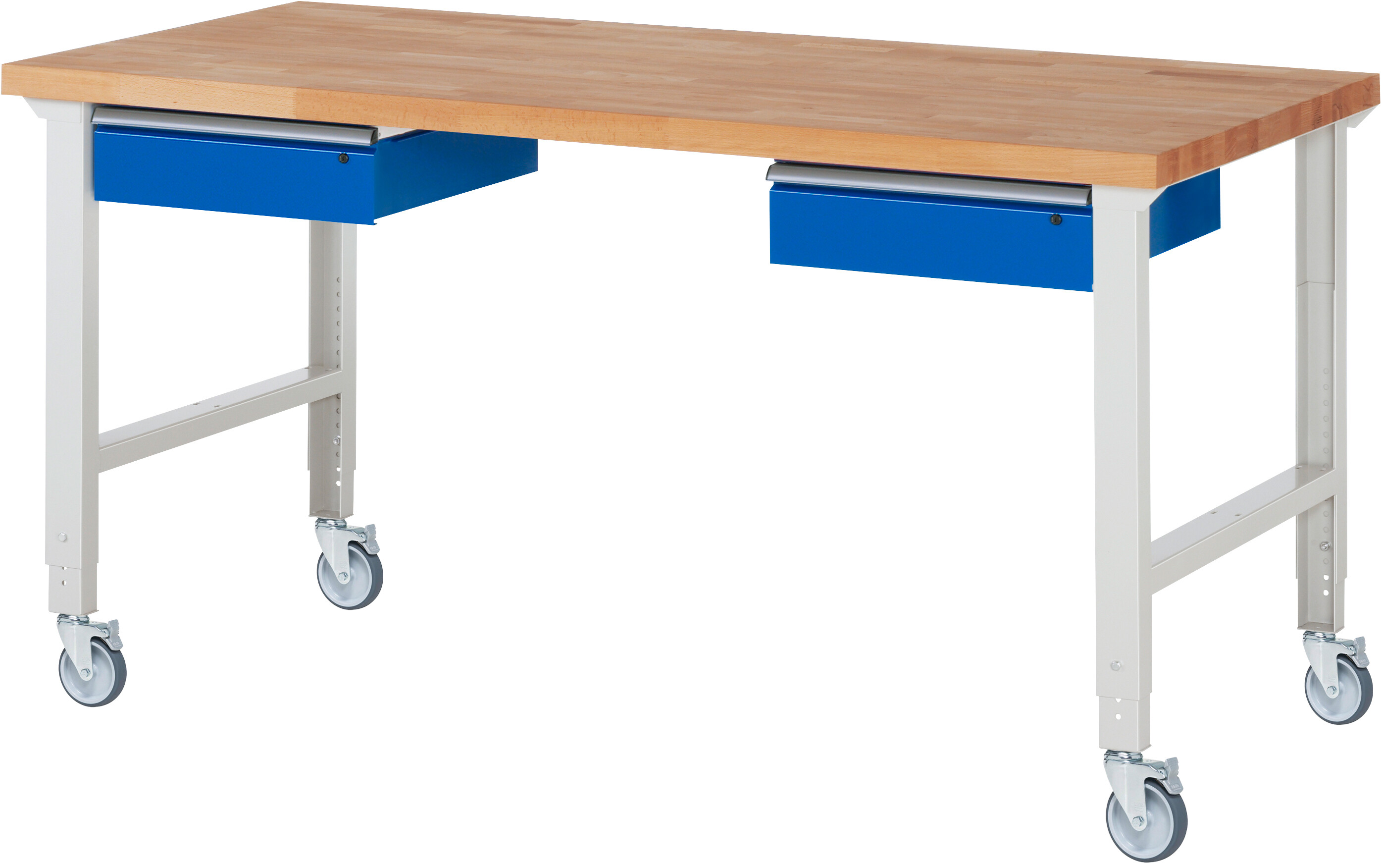 Fahrbare Werkbank 7000 - Modell 7002 4 B2000 x T900 x H950-1000 mm Buche-Massiv-Platte 40 mm. 2 x Schublade (2xH150 mm). Werkbank mit einstellbarer Arbeitshöhe. Pulverbeschichtung Belastbarkeit gesamt max. 200 kg Lieferung komplett montiert Qualitätsgarantie 5 Jahre Made in Germany