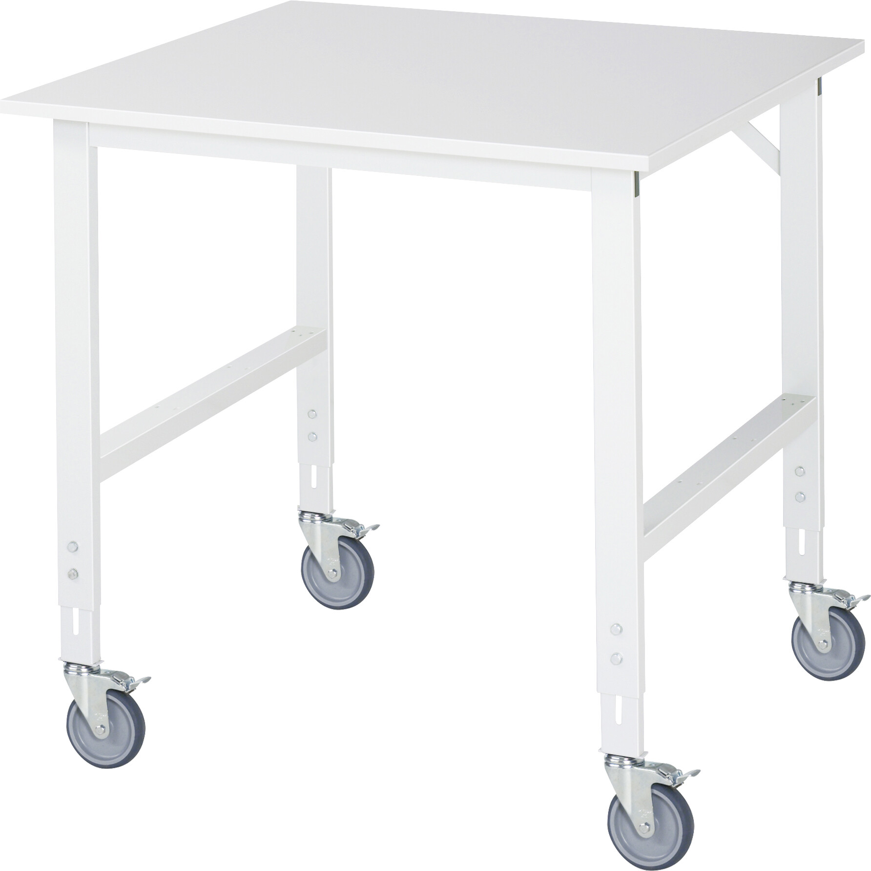 Fahrbarer Arbeitstisch Tom (verstellbar) B1000 x T1000 x H910-1230 mm Melaminharzbeschichtete-Platte 22 mm. Gestell Vierkantrohr. 4 Lenkrollen mit Feststeller Pulverbeschichtung Flächenlast max. 450 kg Lieferung zerlegt - einfachste Montage Qualitätsgarantie 5 Jahre Made in Germany