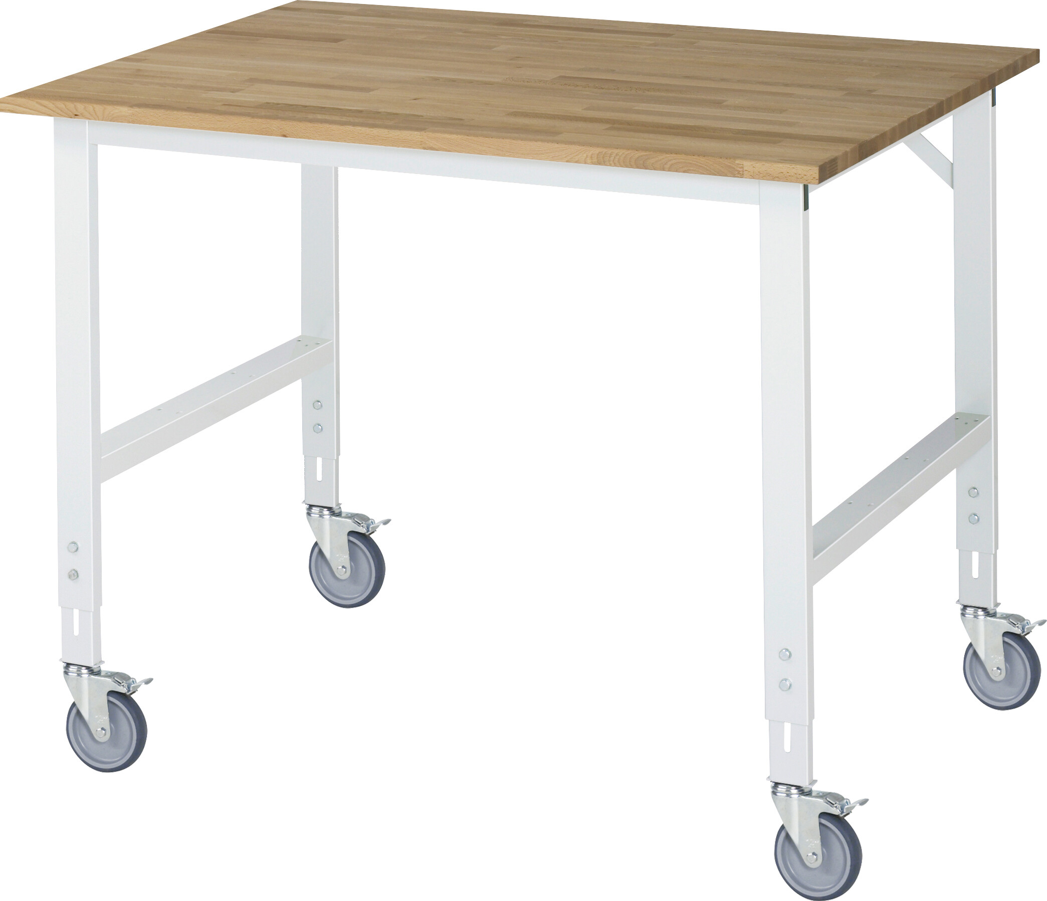 Fahrbarer Arbeitstisch Tom (verstellbar) B1250 x T1000 x H910-1230 mm Buche-Massiv-Arbeitsplatte, Stärke 25 mm. Gestell Vierkantrohr. 4 Lenkrollen mit Feststeller Pulverbeschichtung Flächenlast max. 450 kg Lieferung zerlegt - einfachste Montage Qualitätsgarantie 5 Jahre Made in Germany