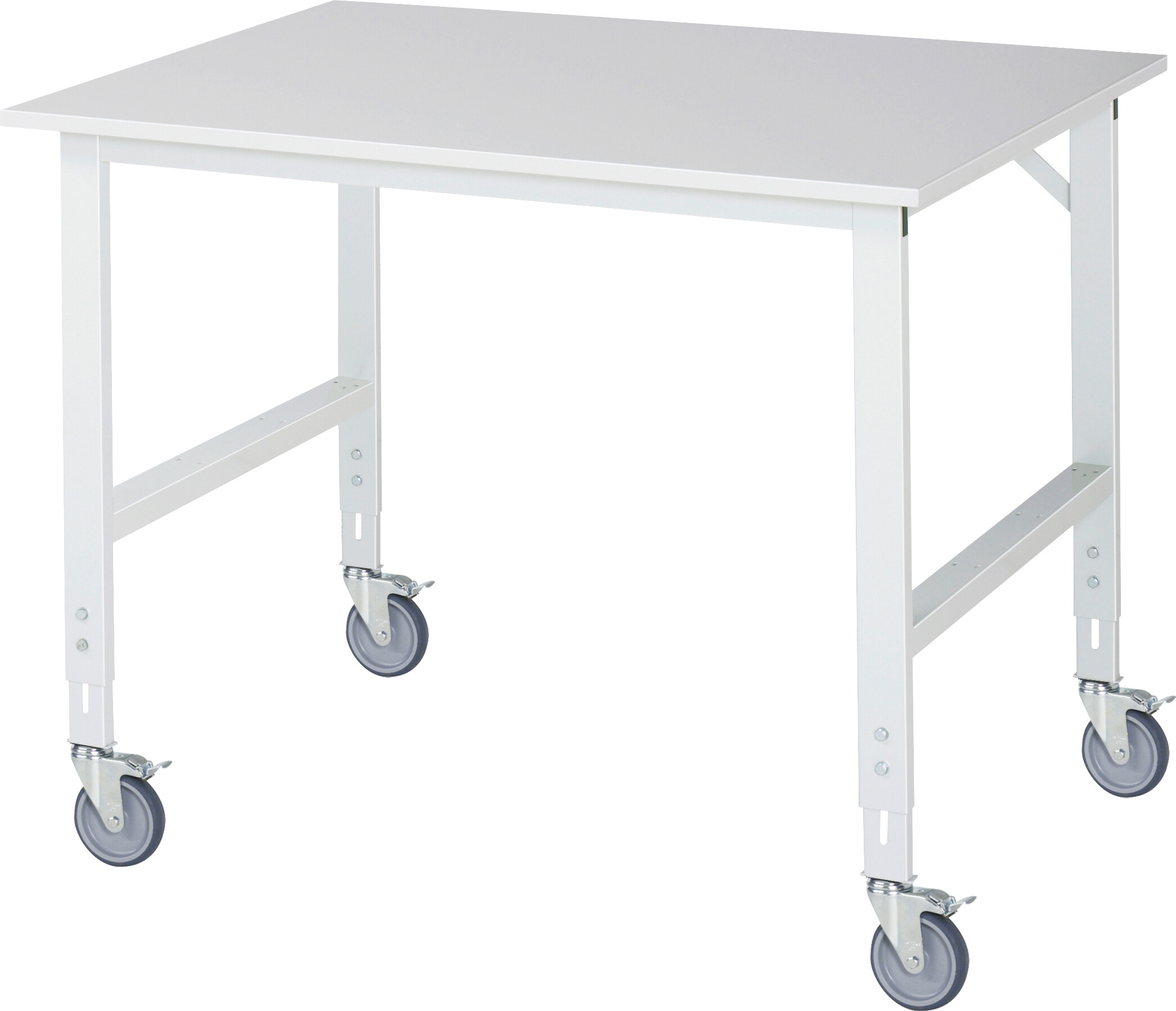 Fahrbarer Arbeitstisch Tom (verstellbar) B1250 x T1000 x H910-1230 mm Melaminharzbeschichtete-Platte 22 mm. Gestell Vierkantrohr. 4 Lenkrollen mit Feststeller Pulverbeschichtung Flächenlast max. 450 kg Lieferung zerlegt - einfachste Montage Qualitätsgarantie 5 Jahre Made in Germany